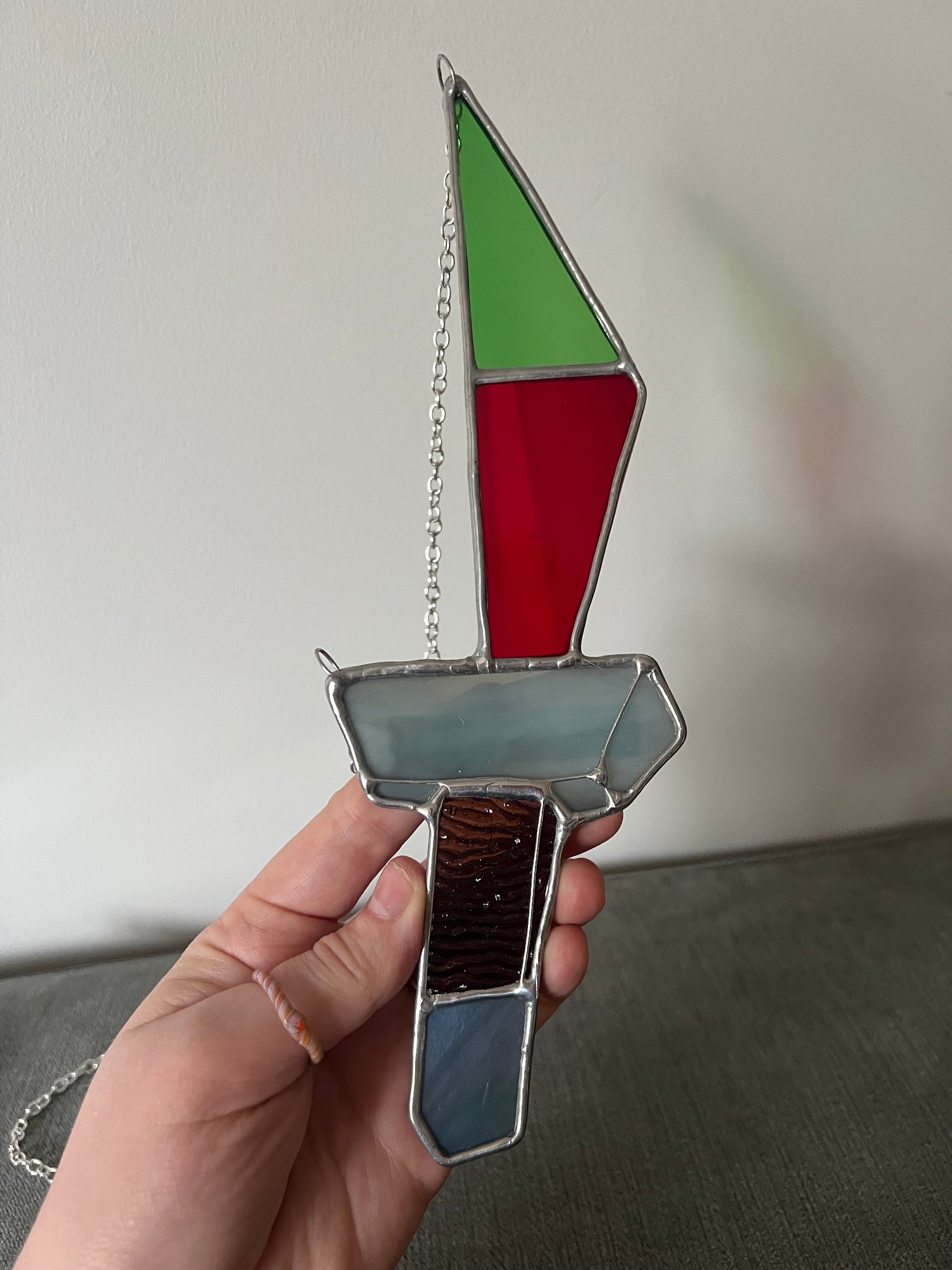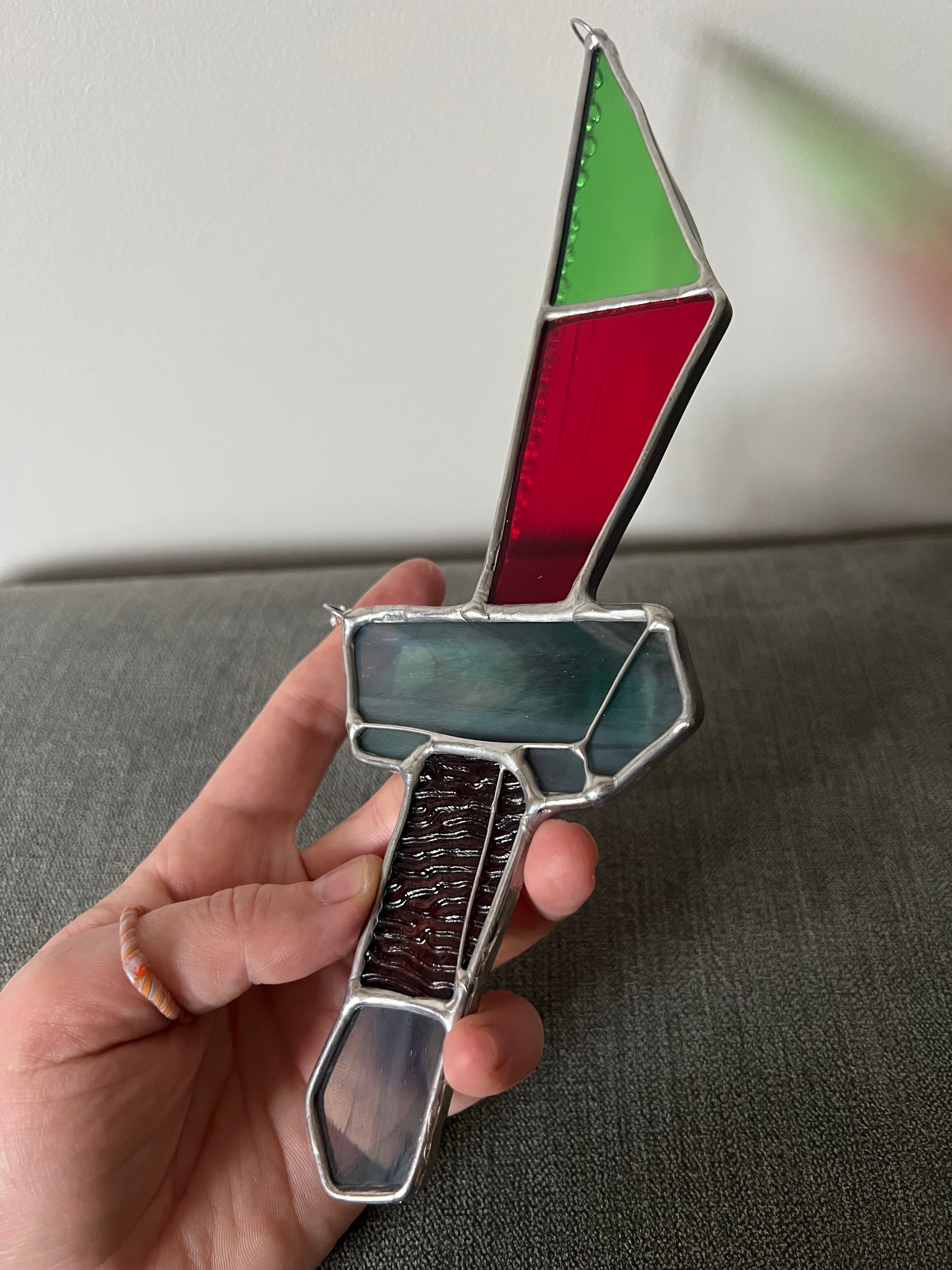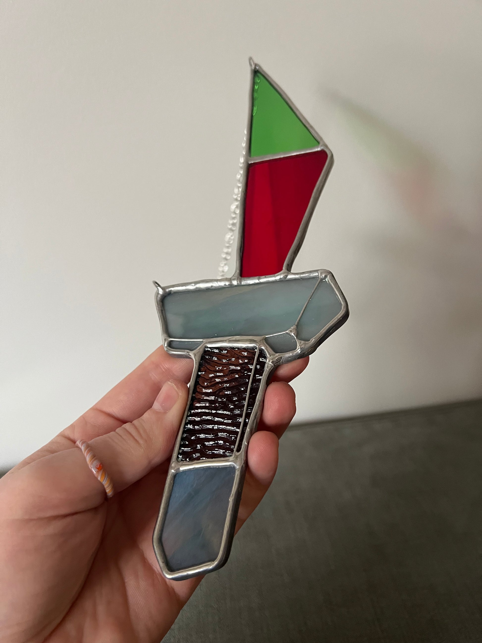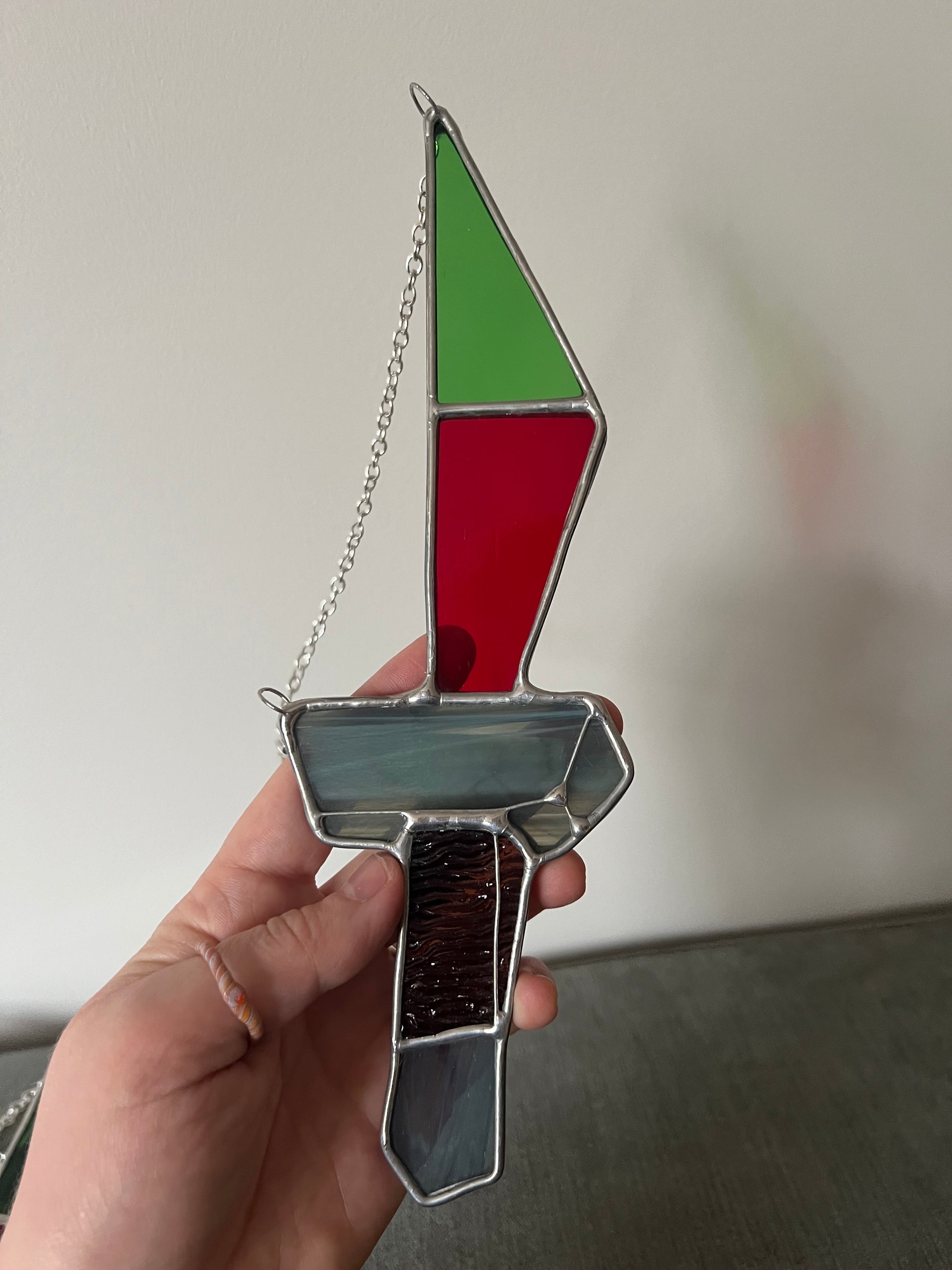 Fanart inspired by the classic super poisoned dragon dagger from Old School Runescape! Please note that what you receive will look slightly different than in the photos, as glass photographs differently than it looks in person (I promise you it looks EVEN better!!!!!). This is a handmade product, so each one shipped out may have variances in the glass, soldering, etc, but will look as true as can be to the original photographed!