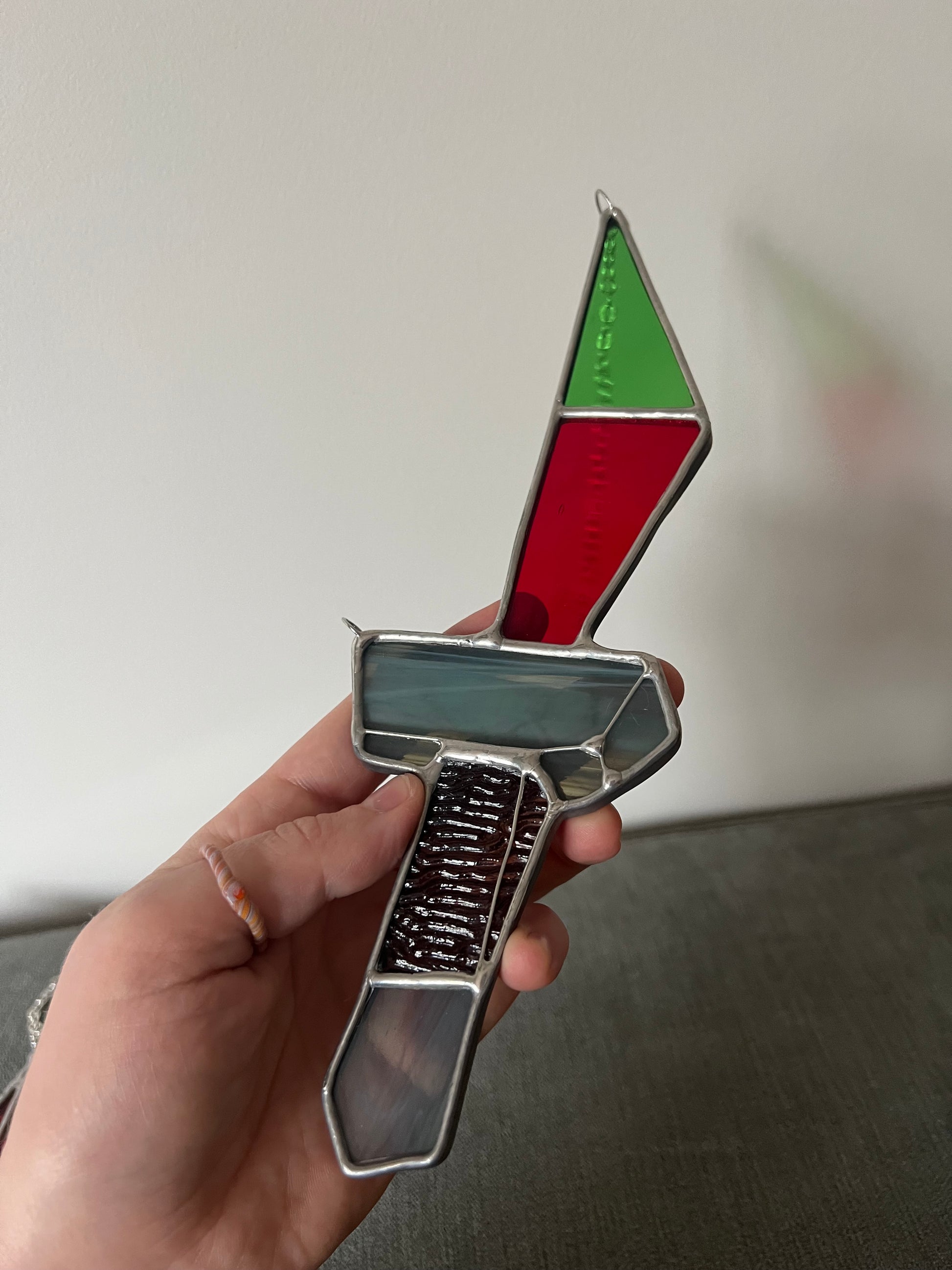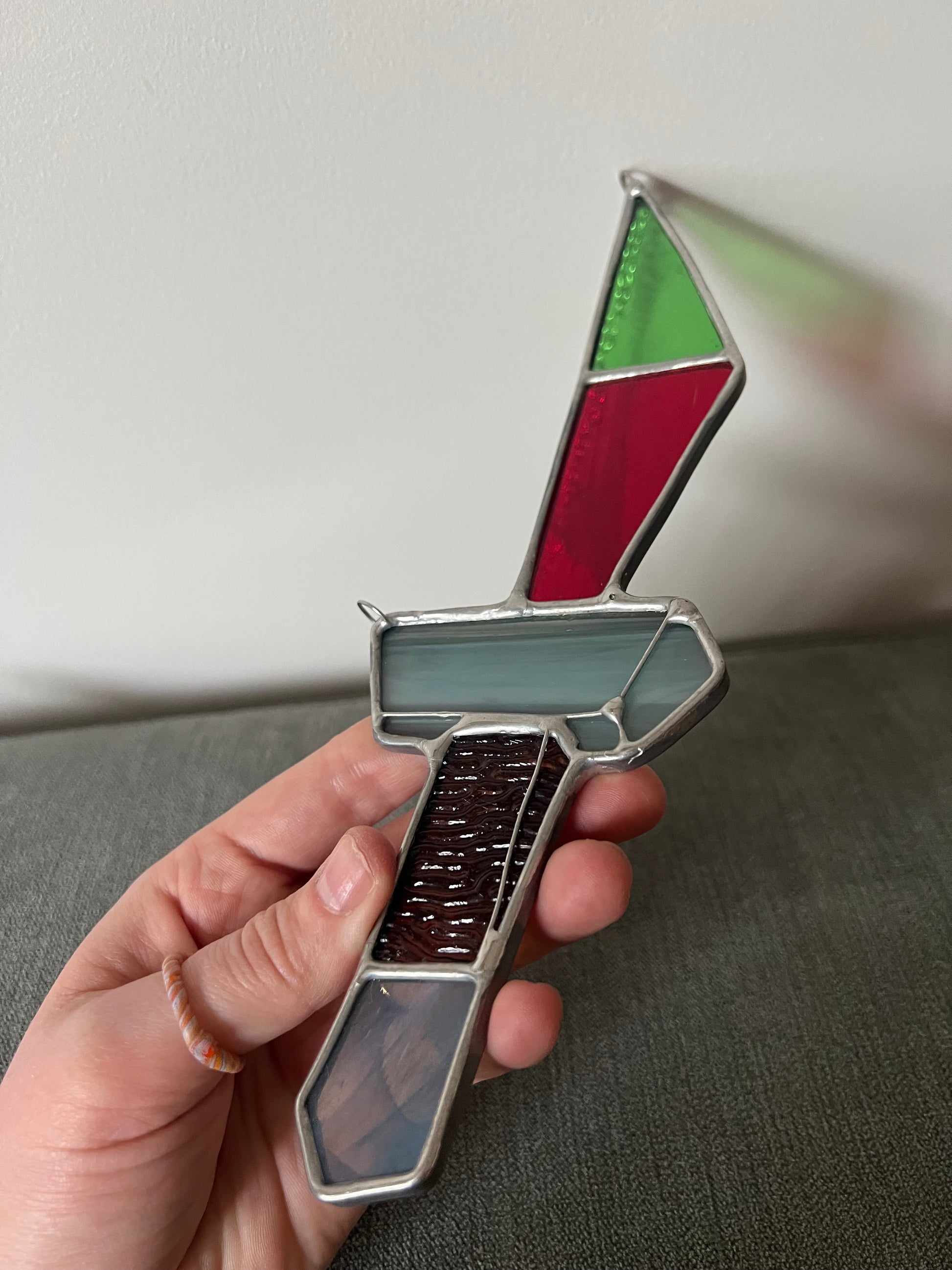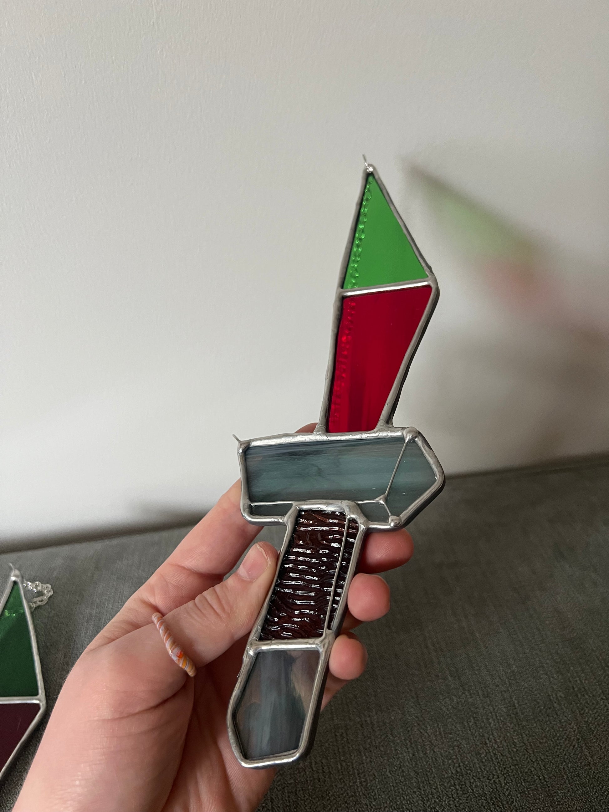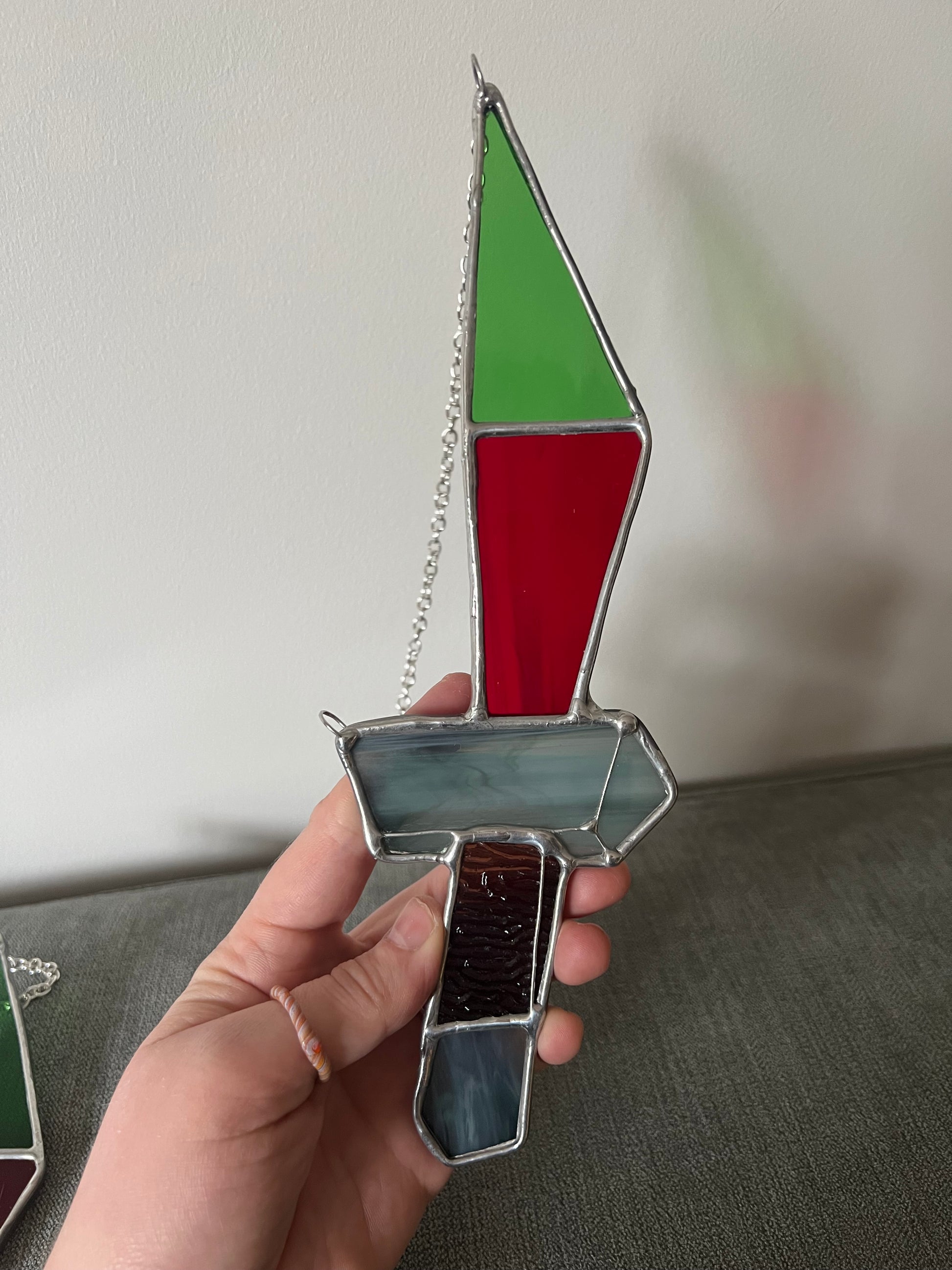Fanart inspired by the classic super poisoned dragon dagger from Old School Runescape! Please note that what you receive will look slightly different than in the photos, as glass photographs differently than it looks in person (I promise you it looks EVEN better!!!!!). This is a handmade product, so each one shipped out may have variances in the glass, soldering, etc, but will look as true as can be to the original photographed!
