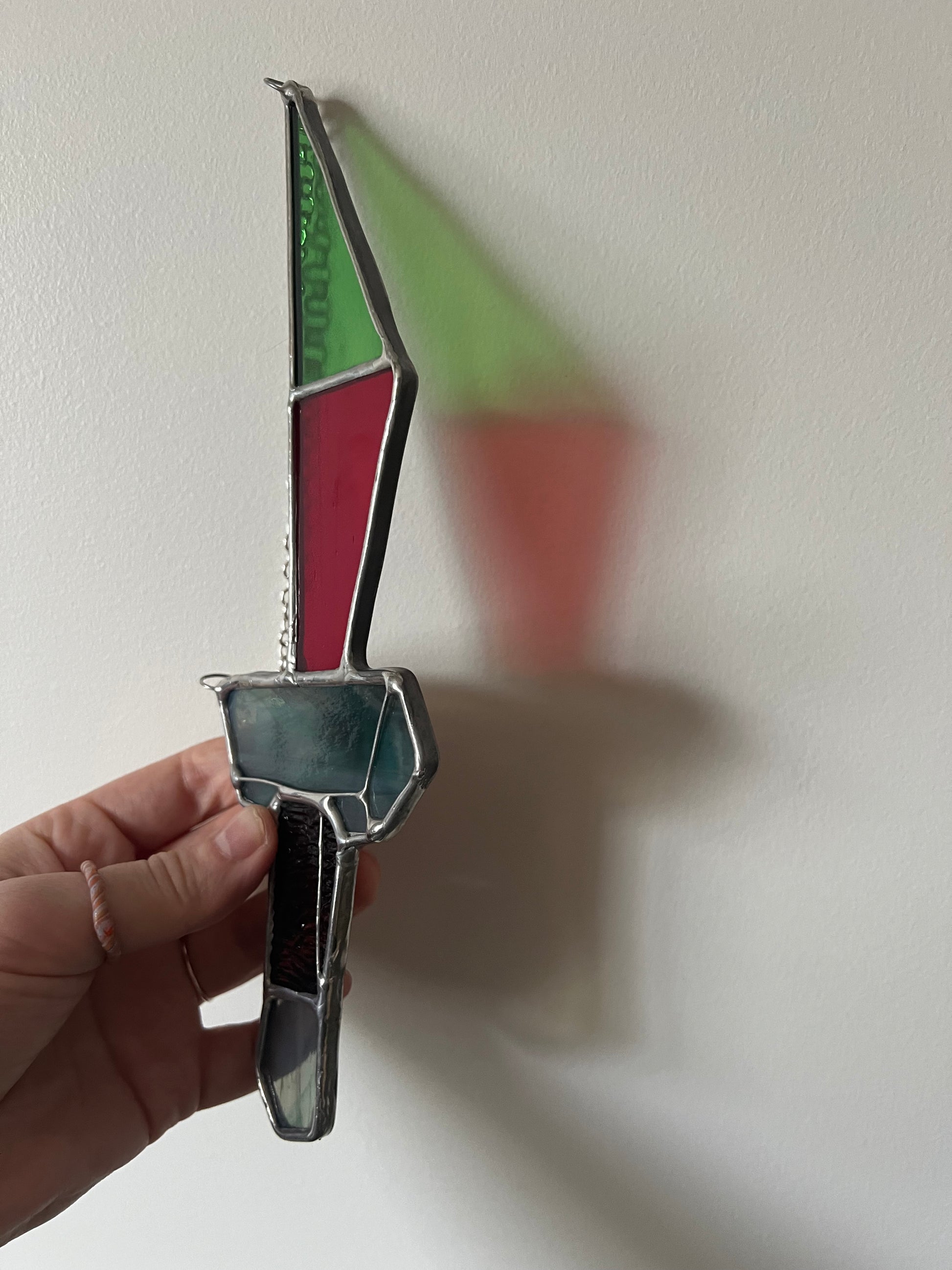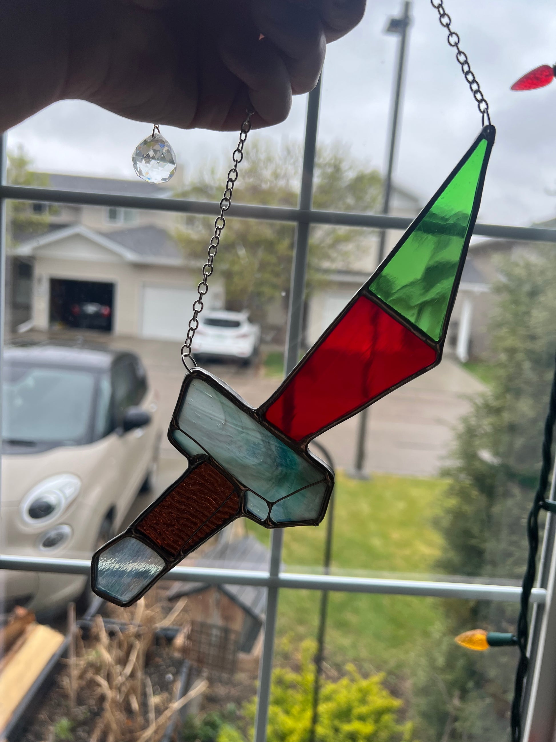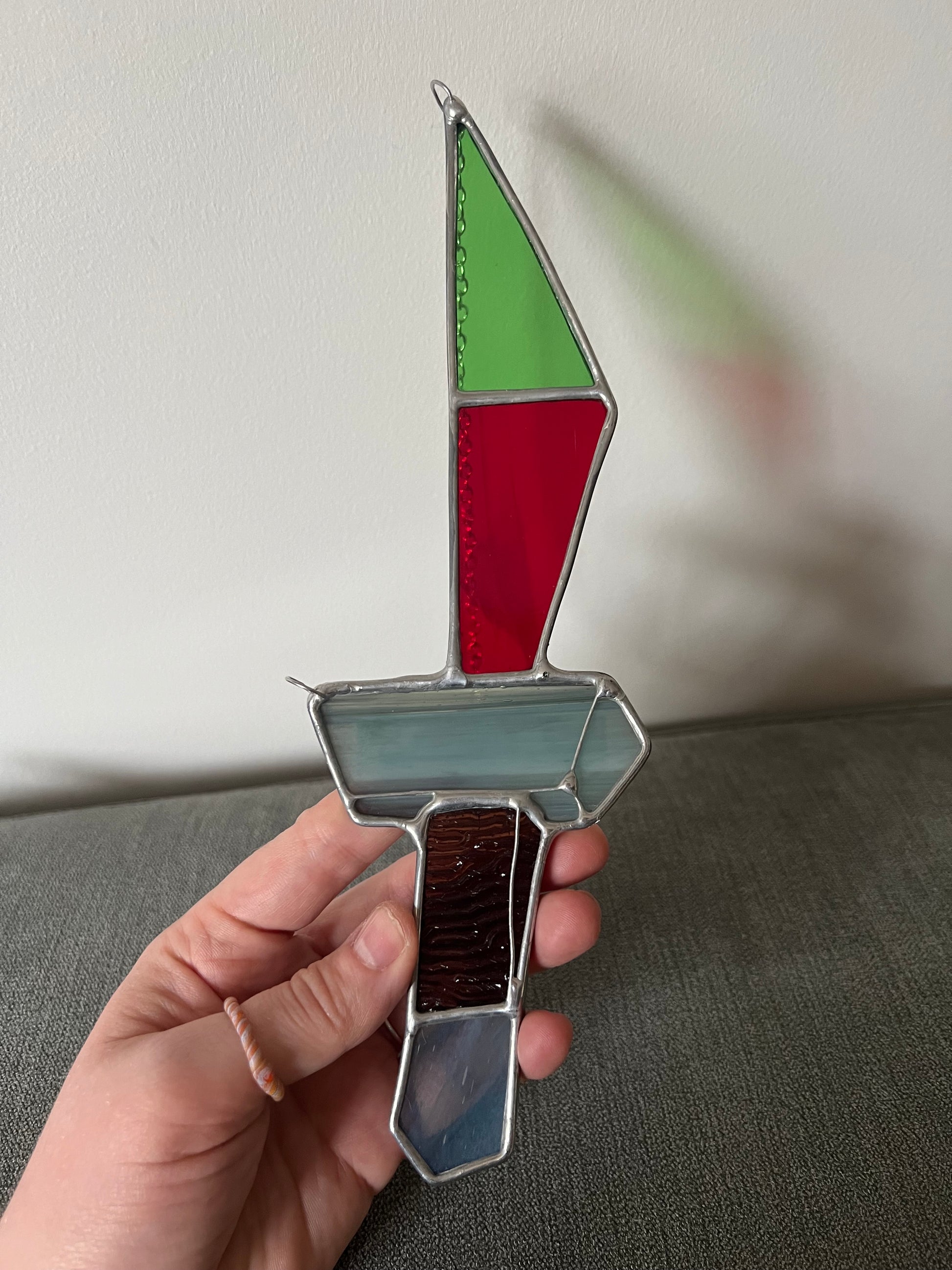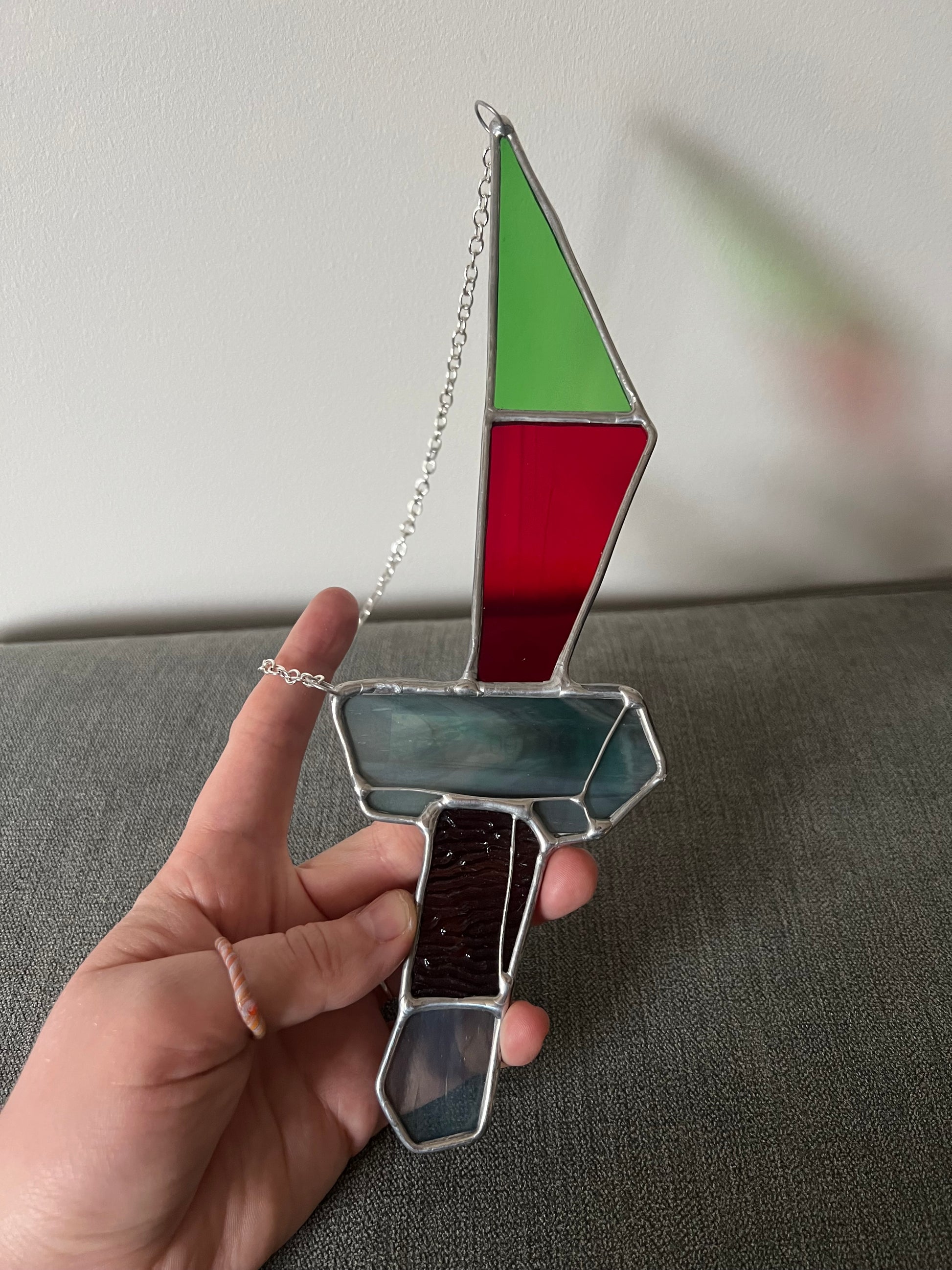 Fanart inspired by the classic super poisoned dragon dagger from Old School Runescape! Please note that what you receive will look slightly different than in the photos, as glass photographs differently than it looks in person (I promise you it looks EVEN better!!!!!). This is a handmade product, so each one shipped out may have variances in the glass, soldering, etc, but will look as true as can be to the original photographed!