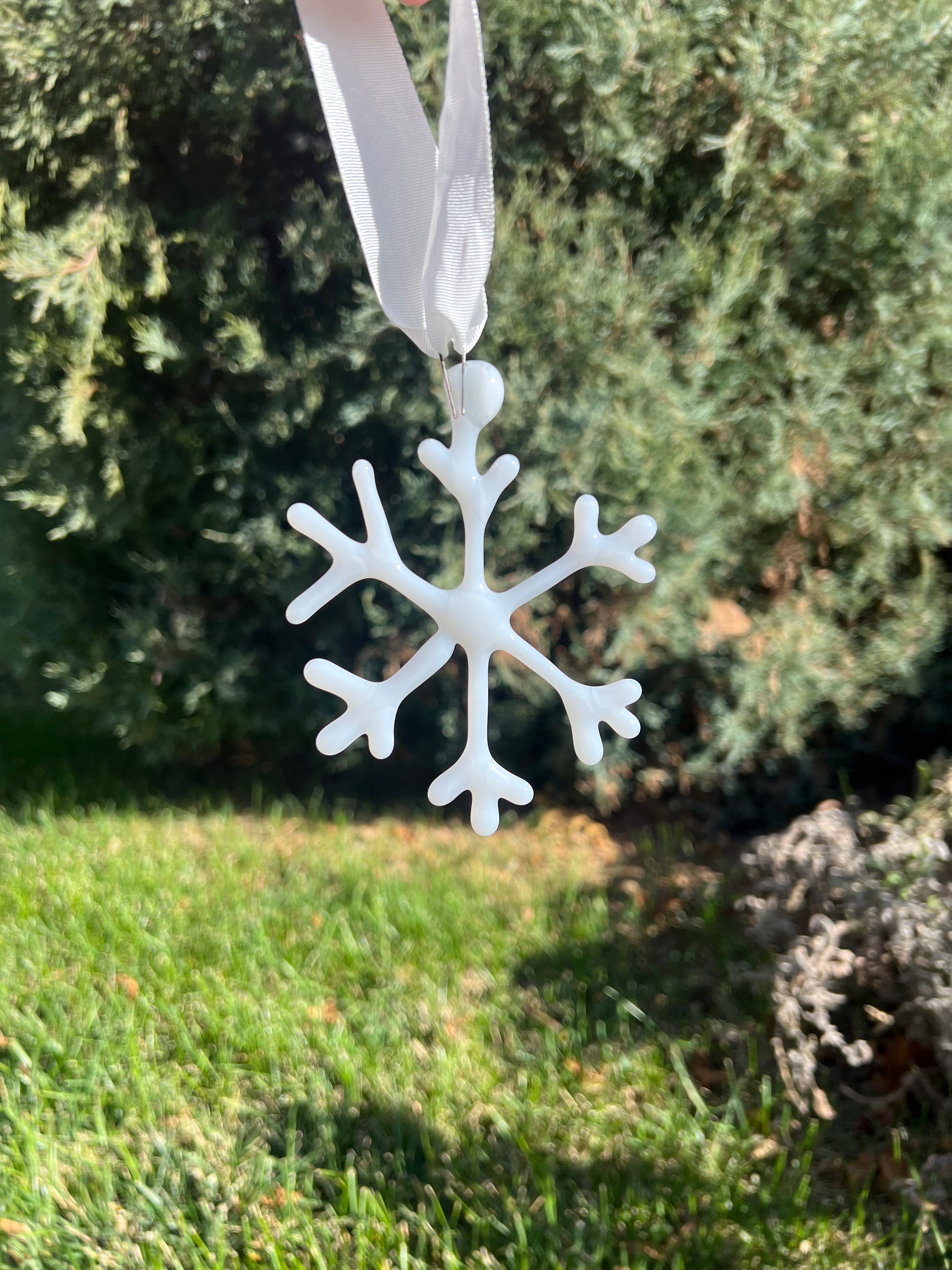 In this class you will get to create two snowflakes using glass shards and glue. You will be handling sharp pieces of glass, so please keep that in mind before registering for the class. Sizes will vary depending on the shards you use! But they are around a large ornament size (4 maybe 5 inches). Please bring a separate pair of indoor shoes with a closed toe to wear in the studio and wear clothing you don't mind getting a bit messy!