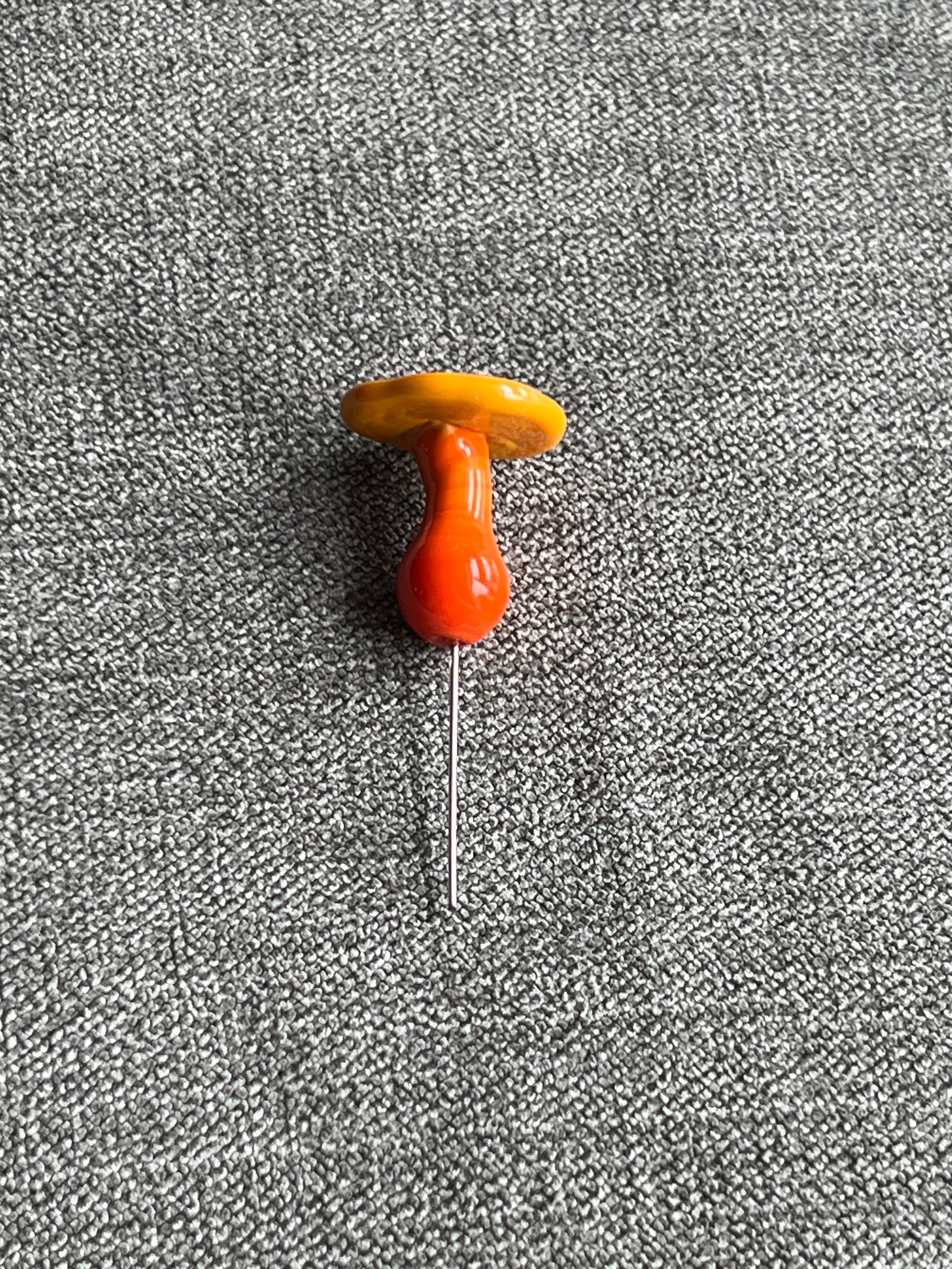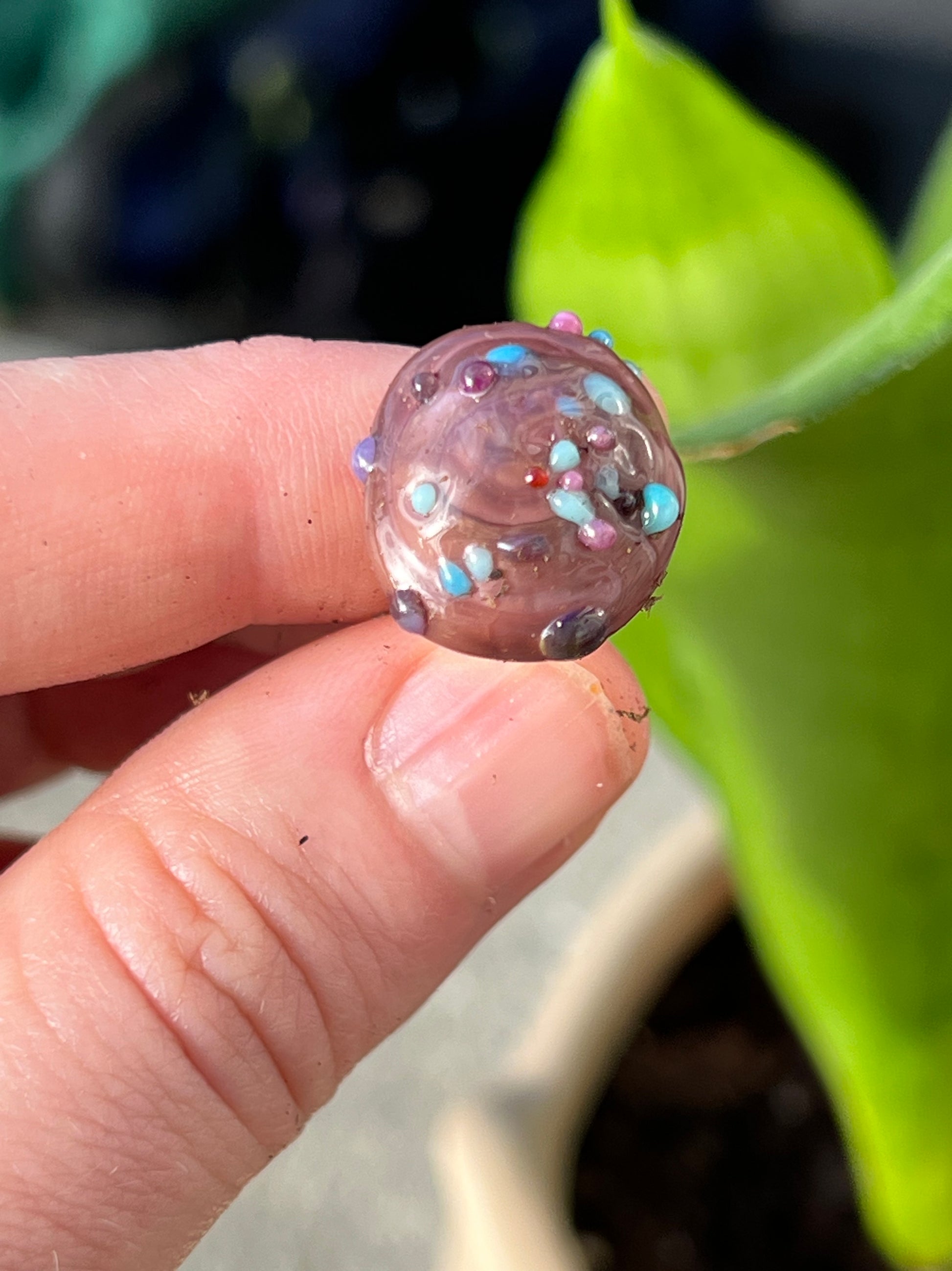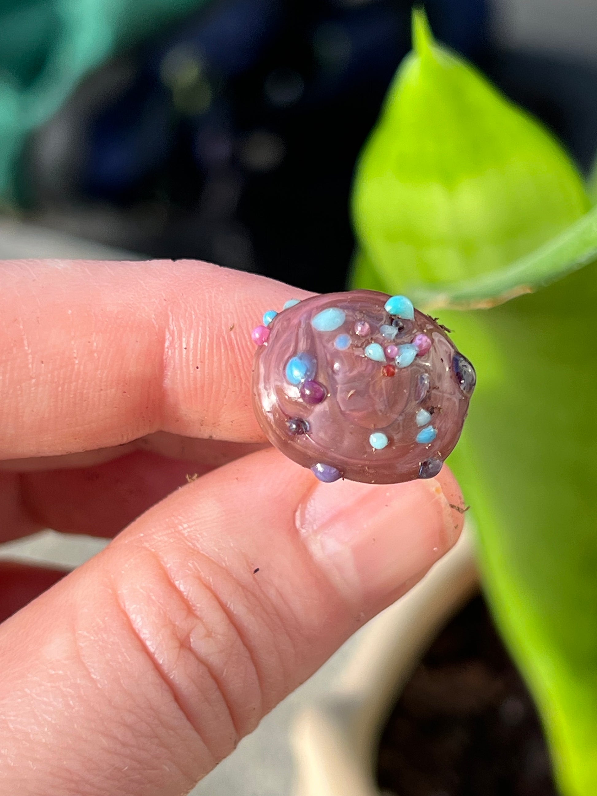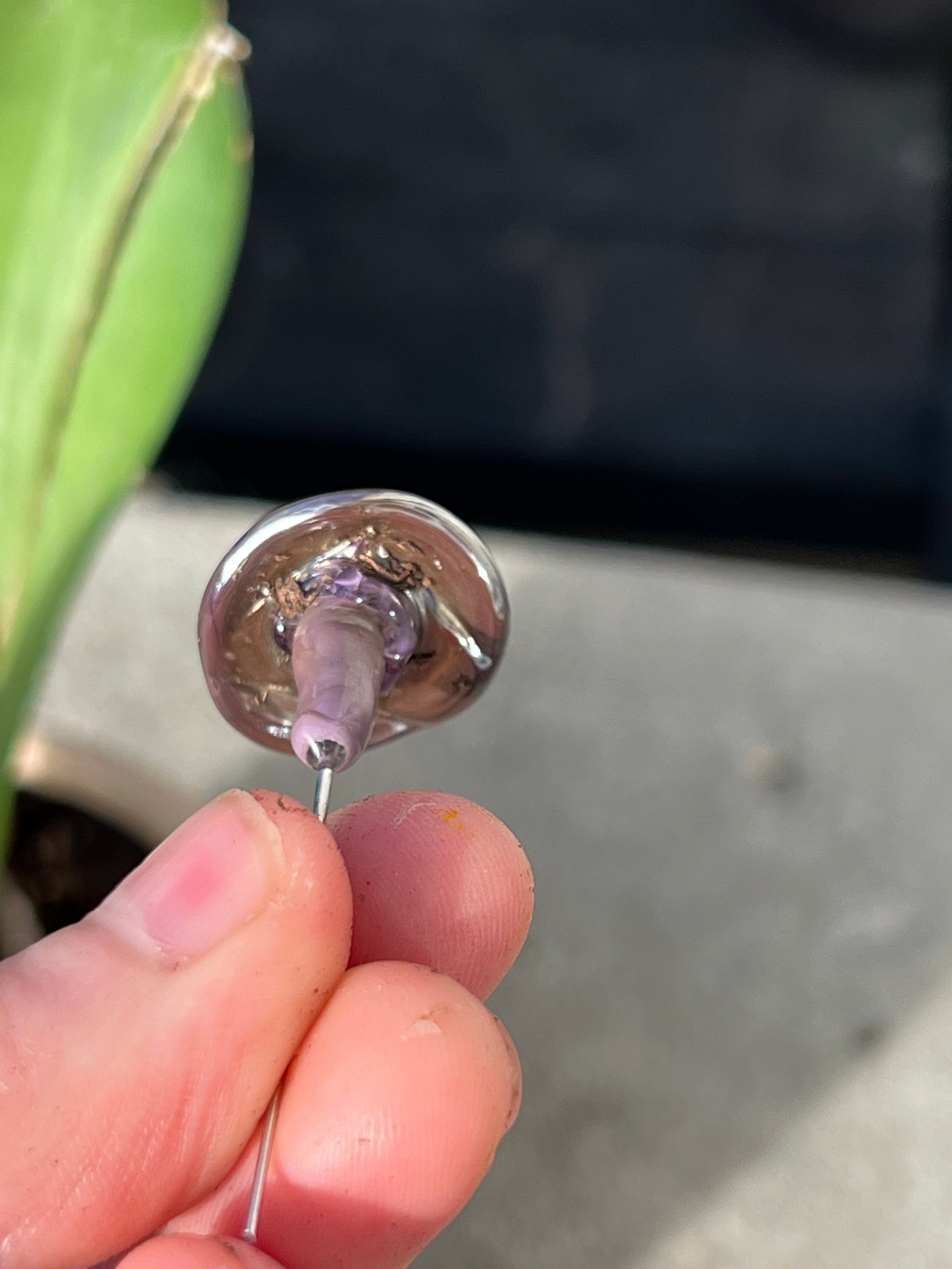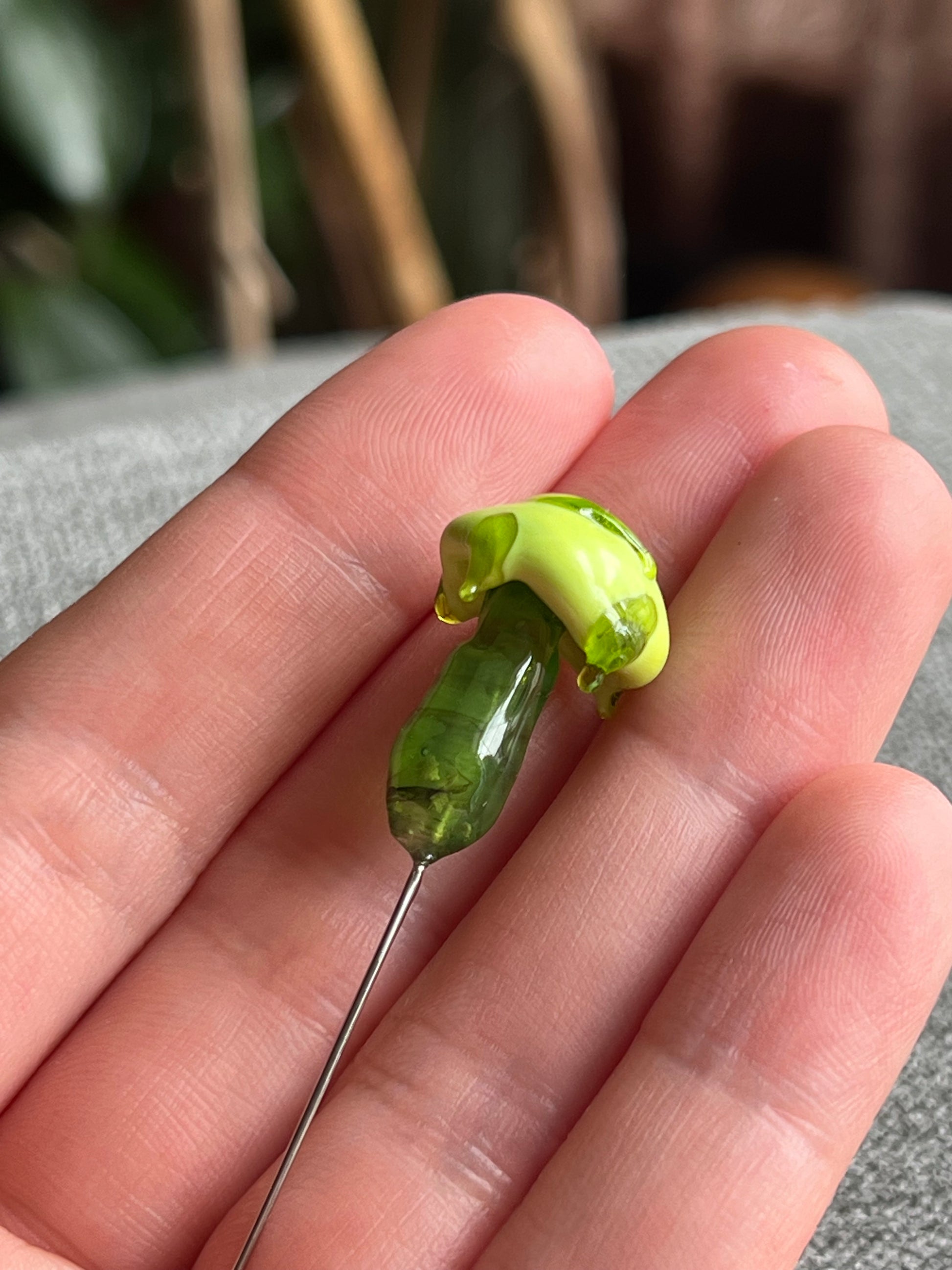 The glass used is soft glass 104 coe, and is annealed to perfection. The metal stake is repurposed crafting wire and is flexible.