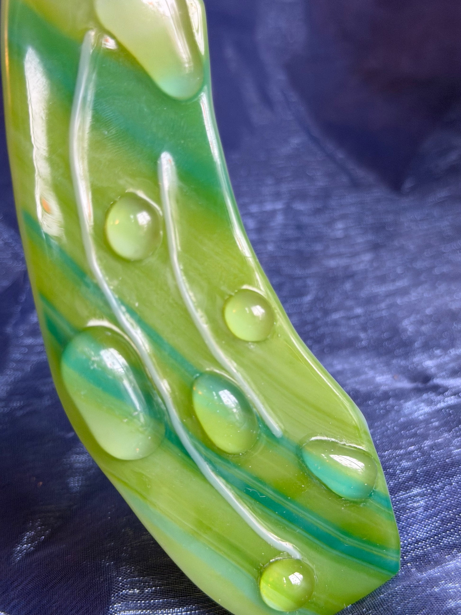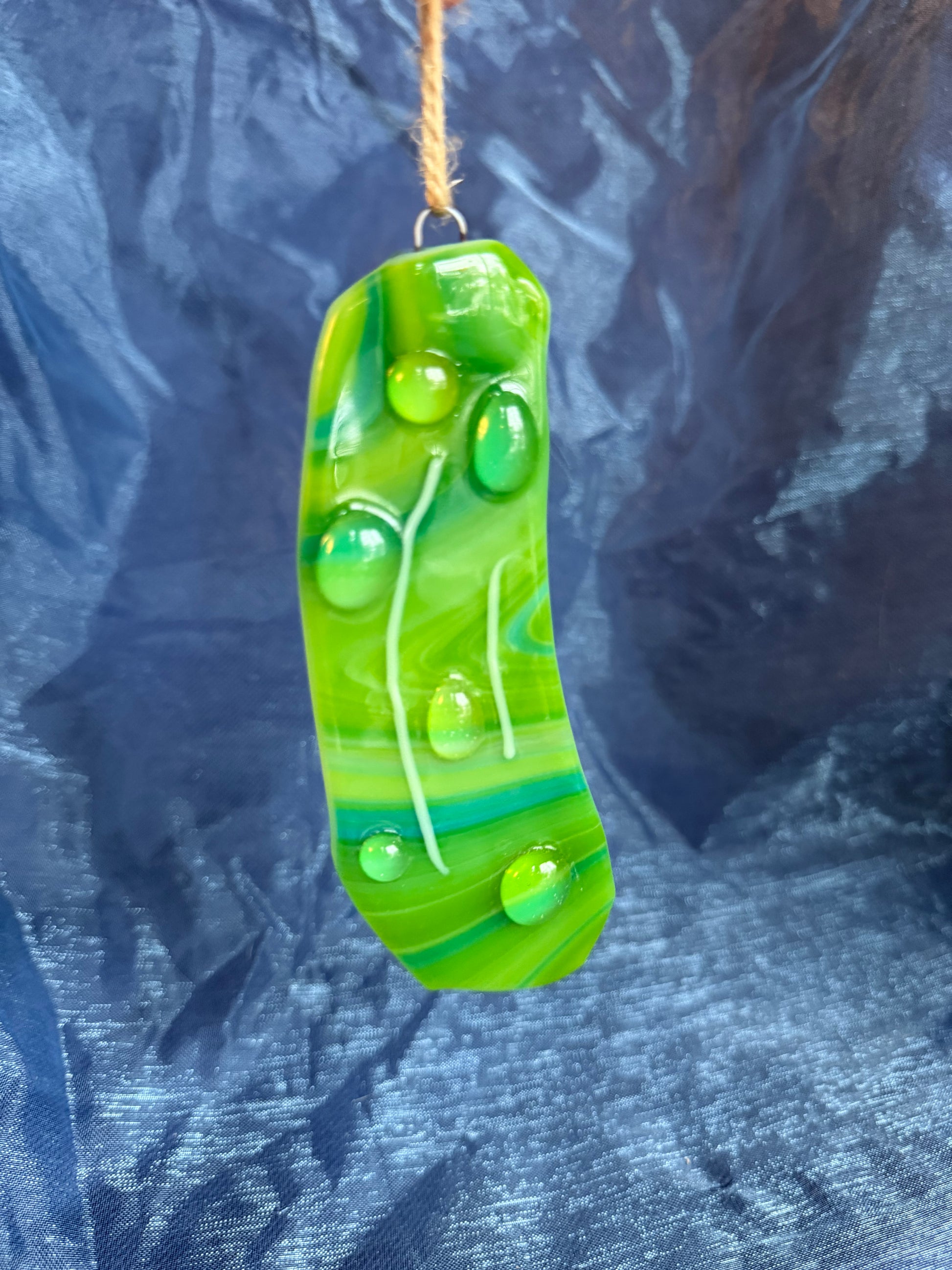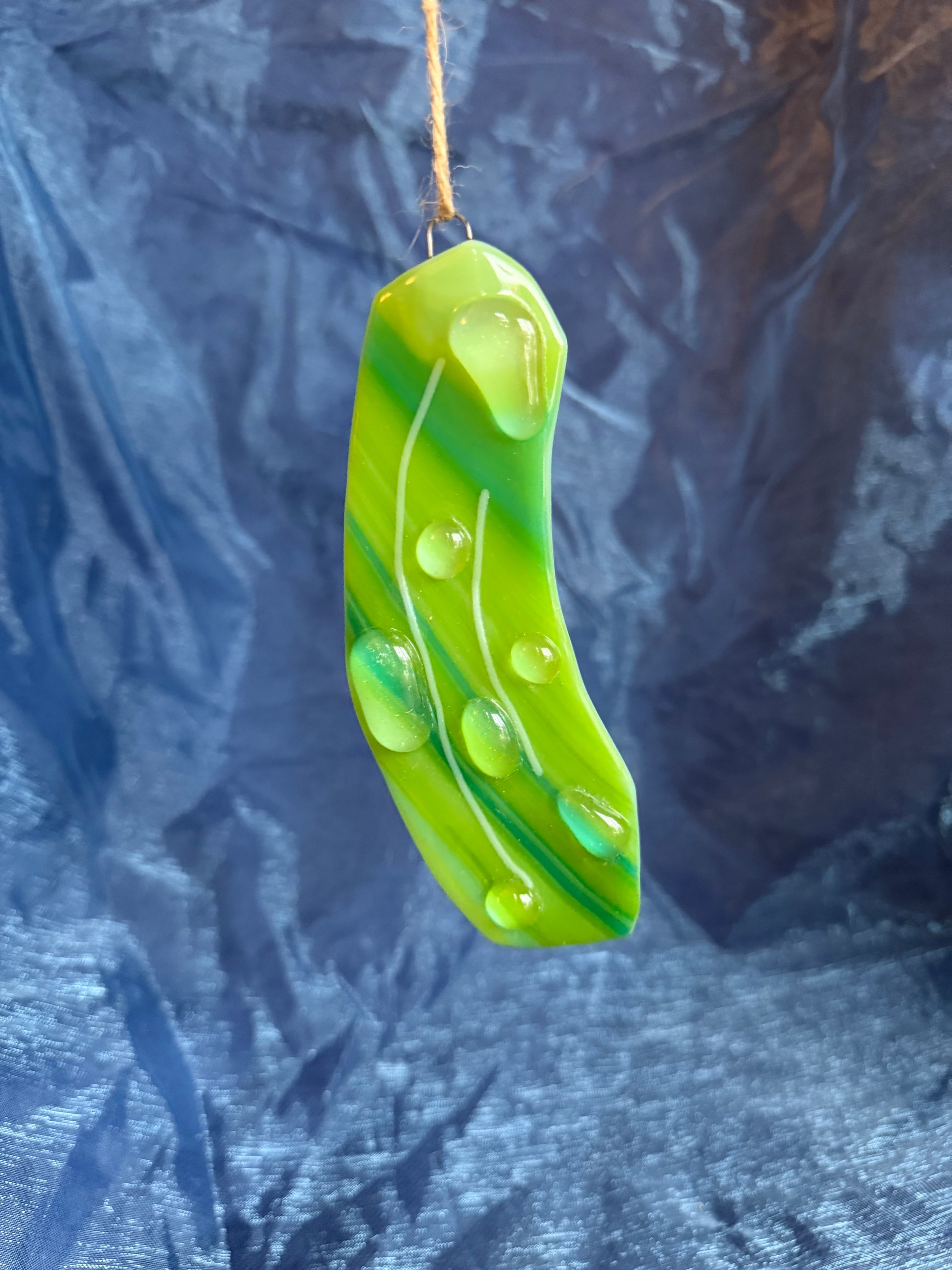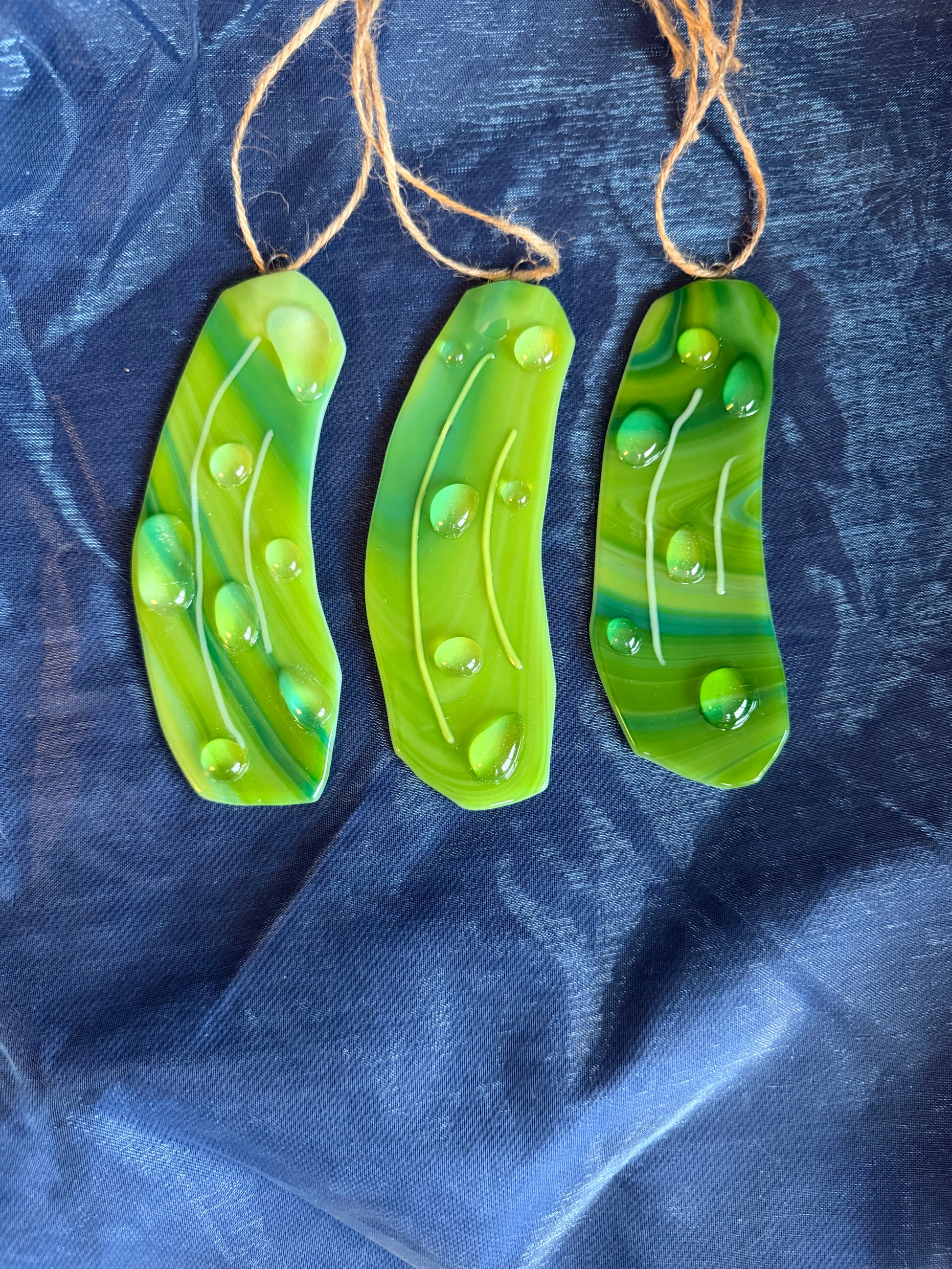 Handmade fused glass pickle ornament/decoration!!! I made these to raise some money for a new kitten I rescued in front of McDonald’s. He is named Pickle, hence the pickle ornaments!!