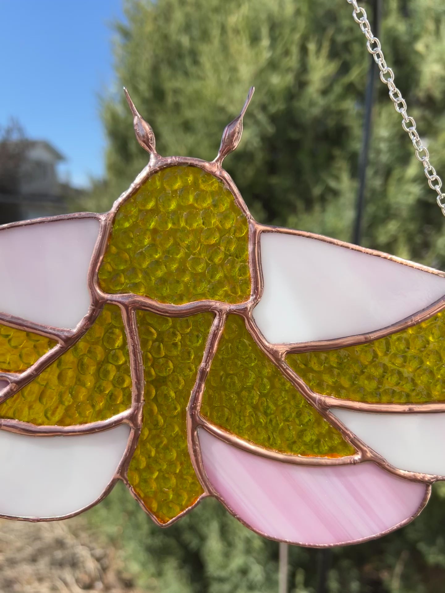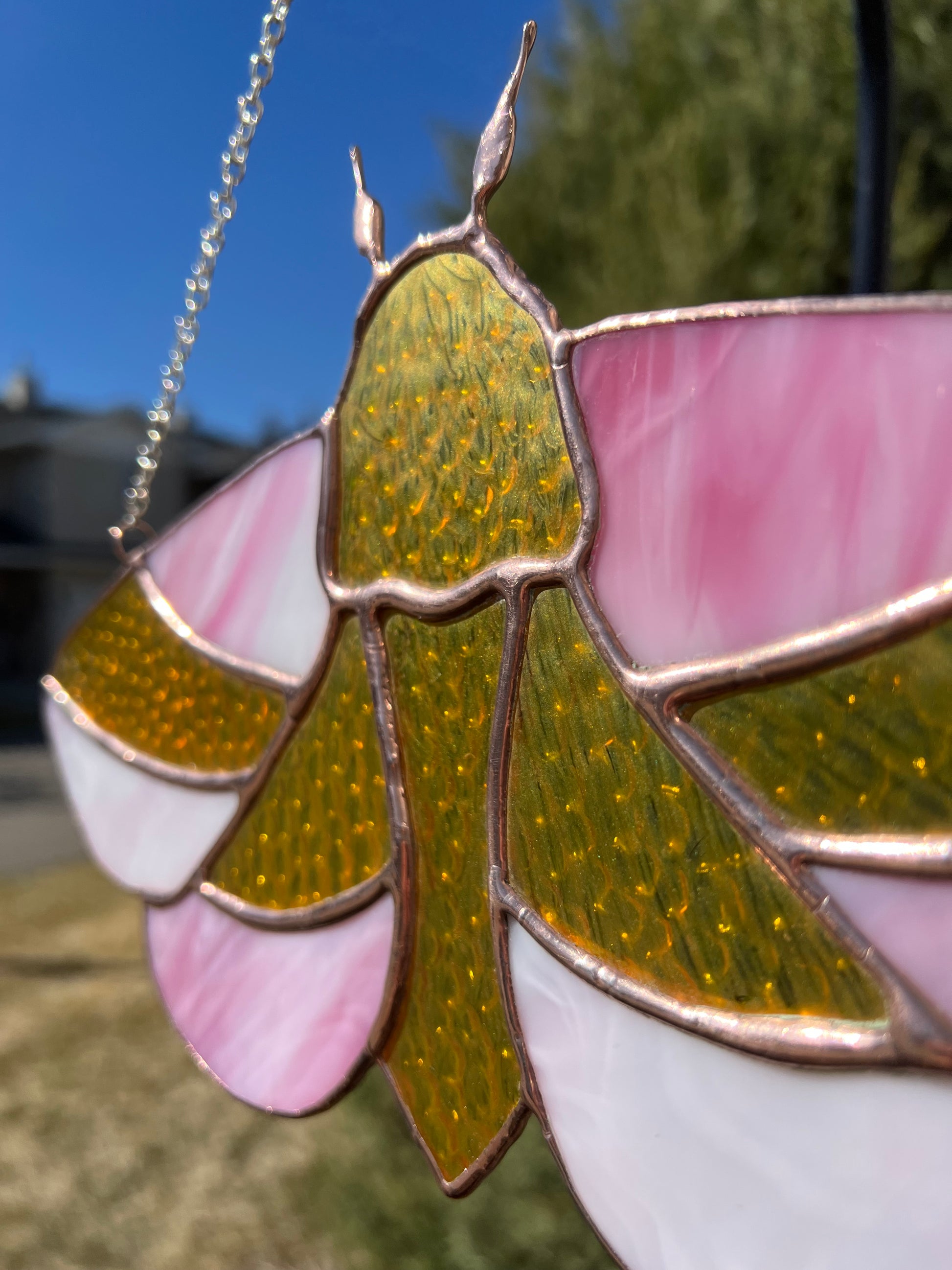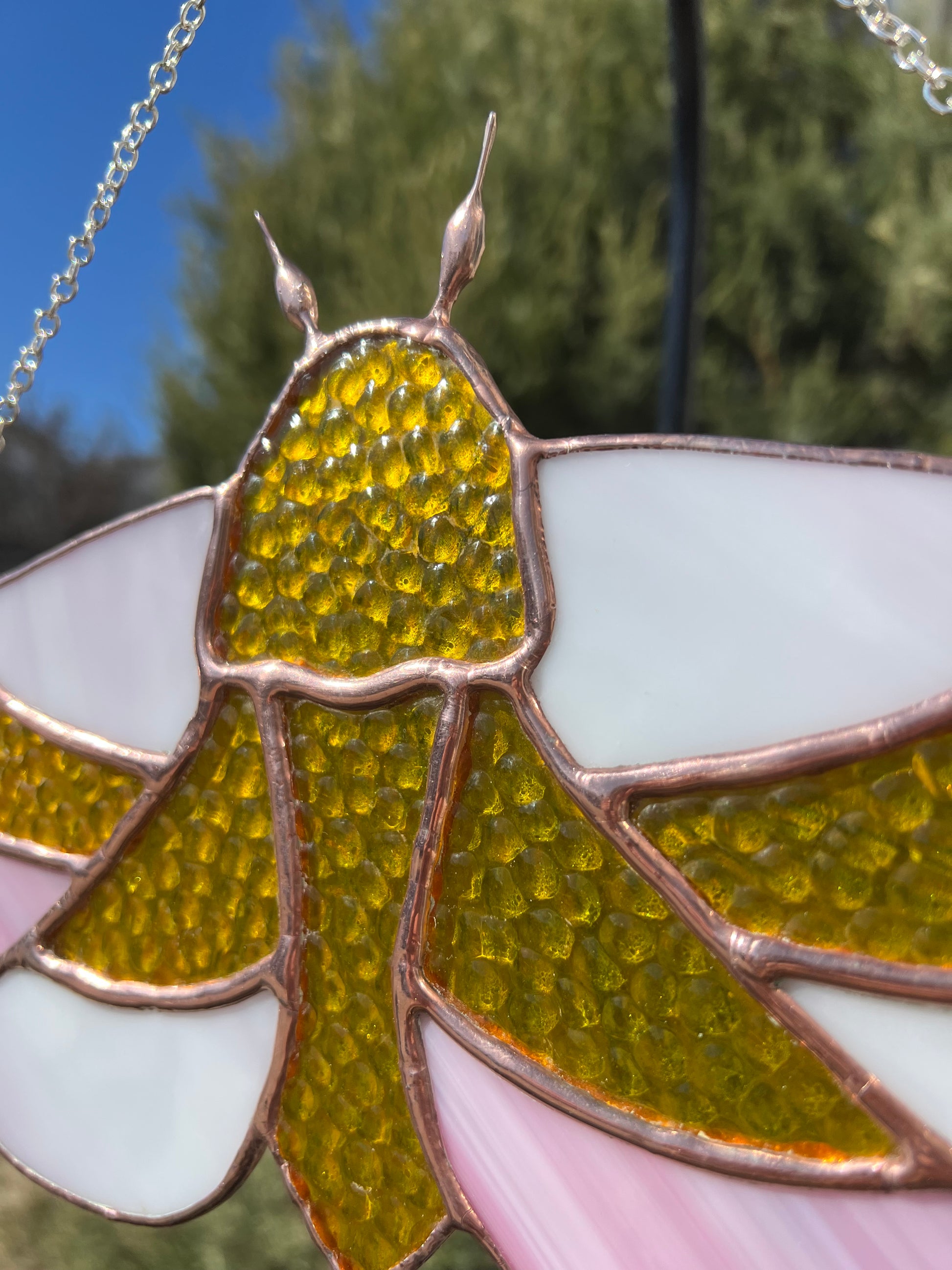 A cozy, pretty yellow and pink moth out of stained glass!!! Please remember this is handmade, and every piece you receive will be even MORE beautiful in person, but may have a slight variation due to its handmade nature.