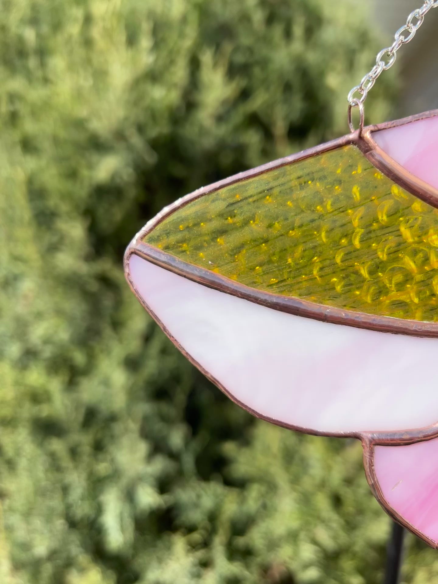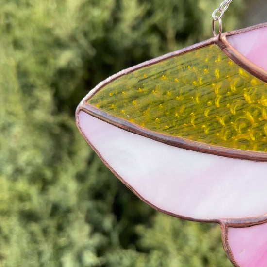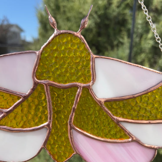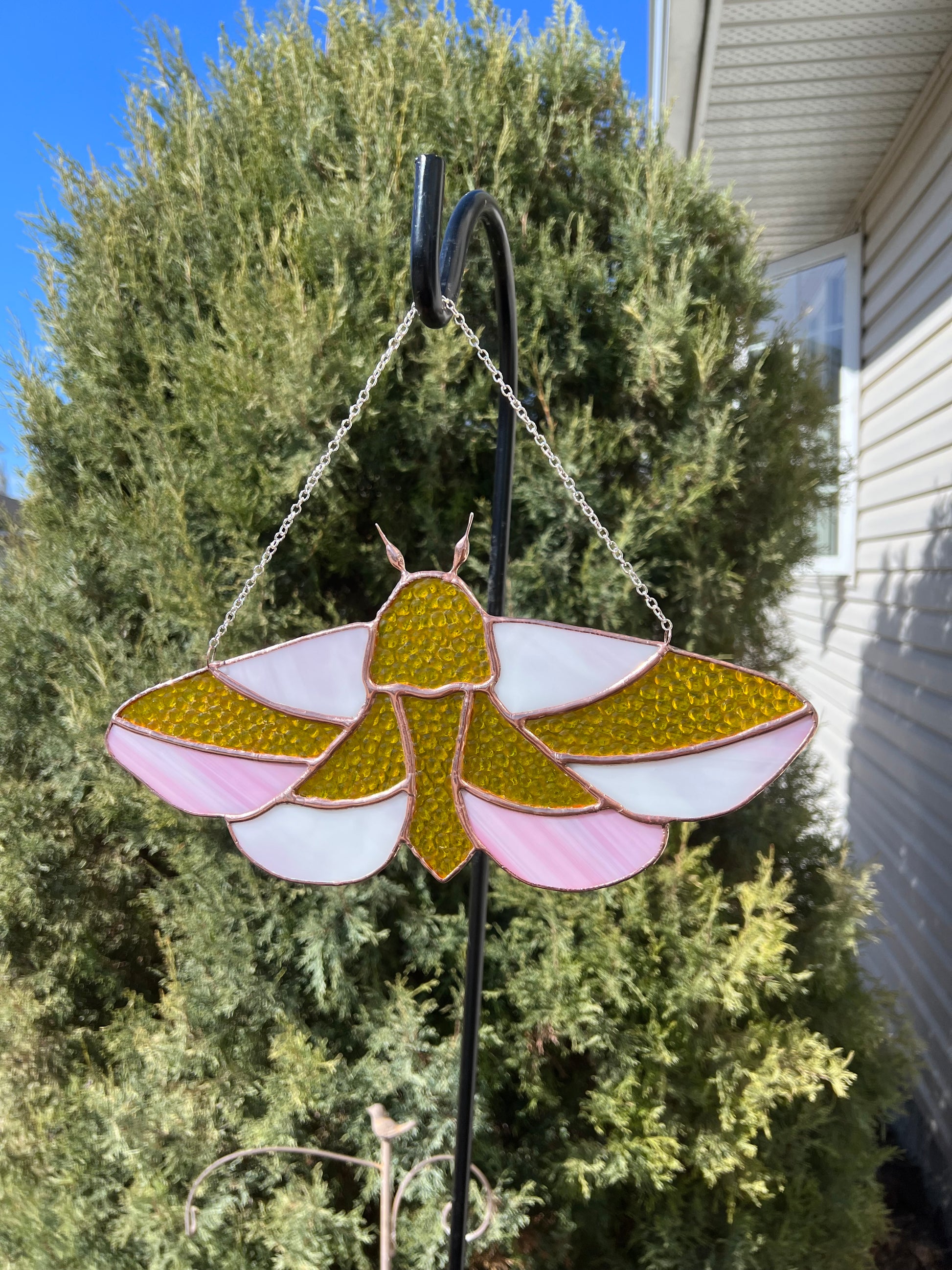 A cozy, pretty yellow and pink moth out of stained glass!!! Please remember this is handmade, and every piece you receive will be even MORE beautiful in person, but may have a slight variation due to its handmade nature.