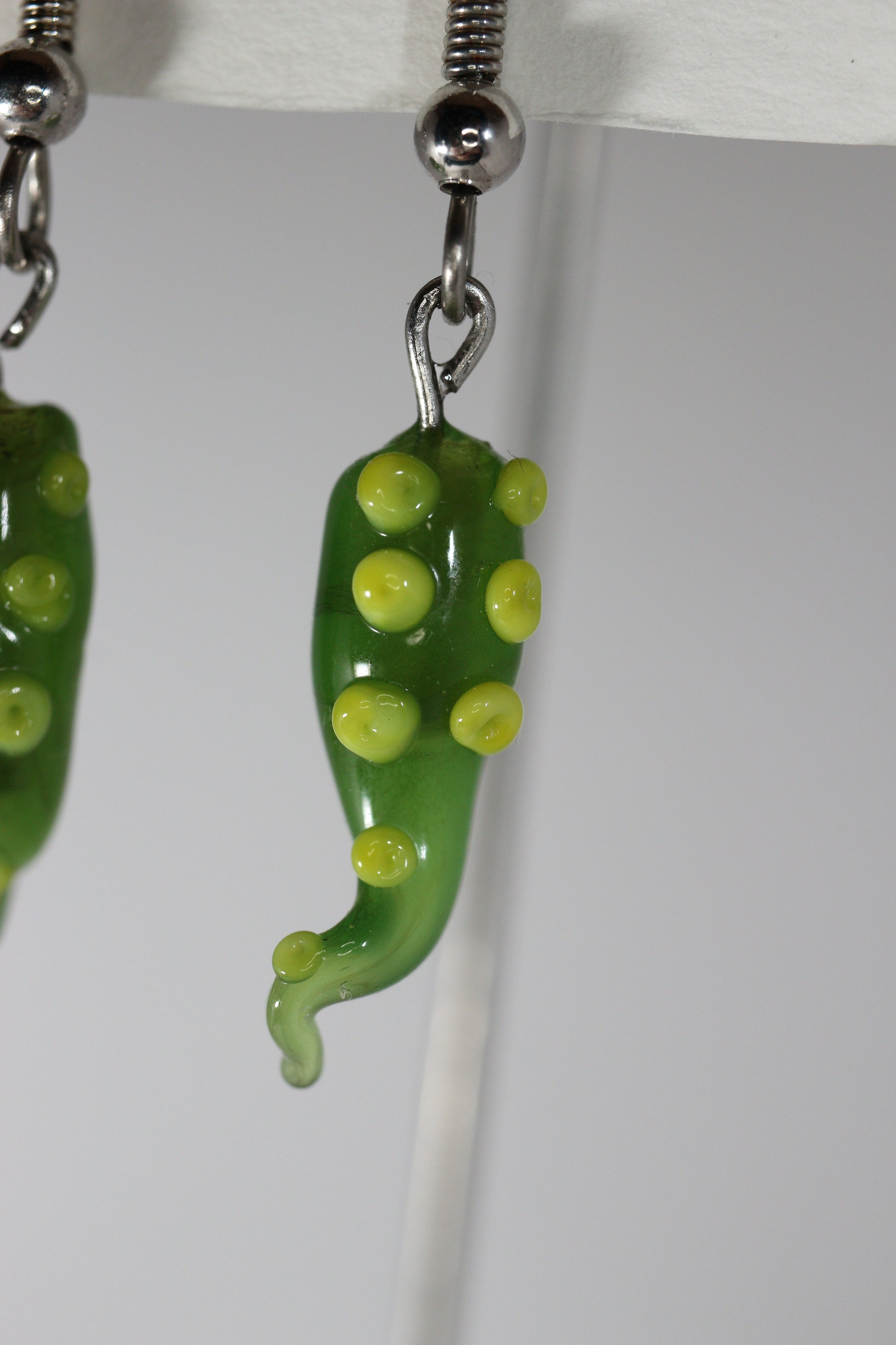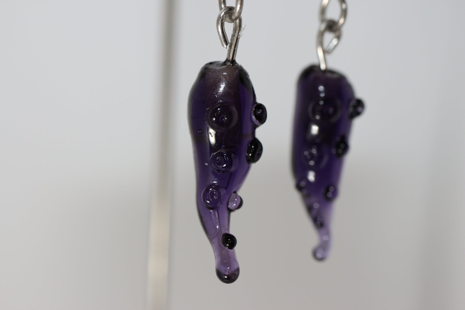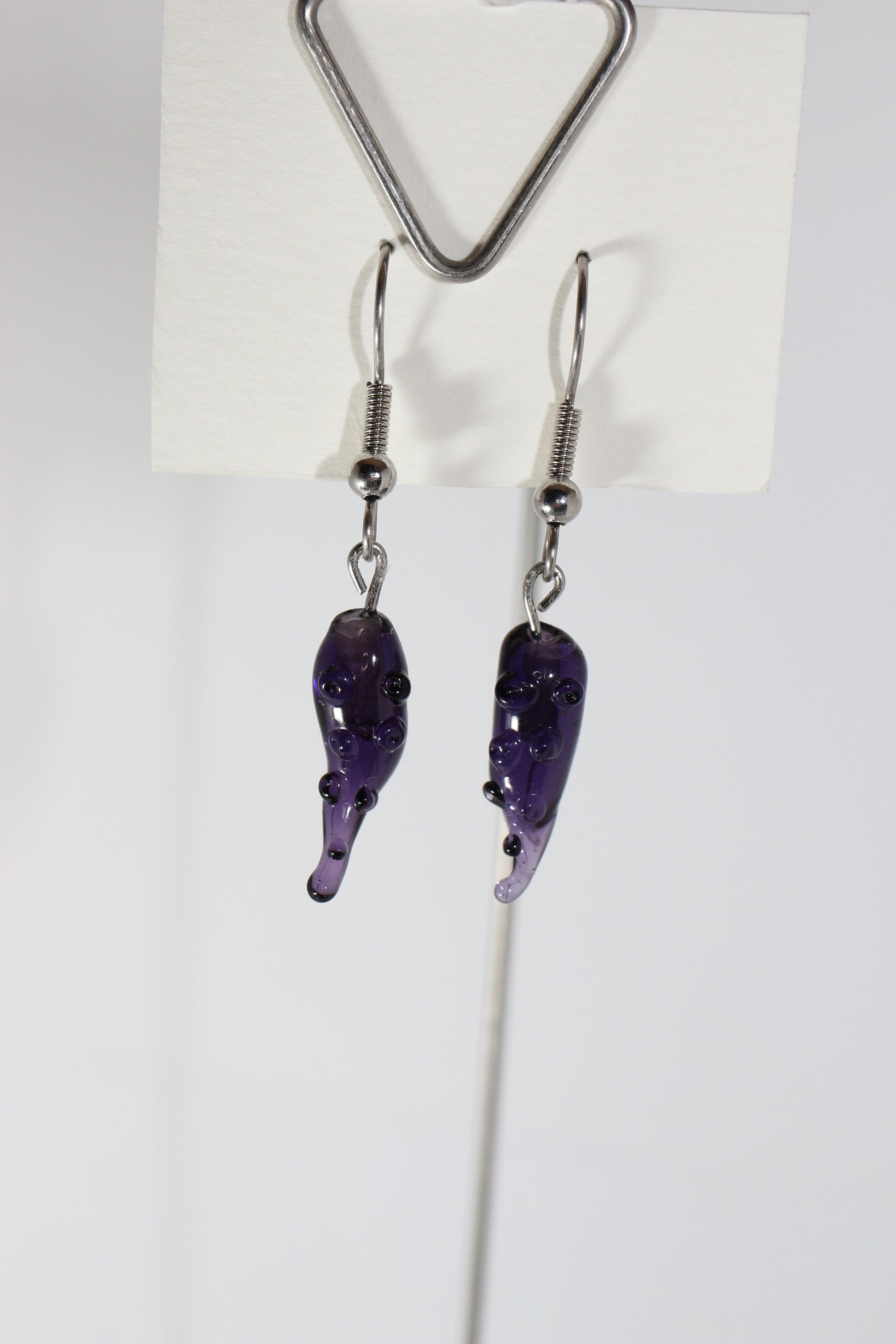 Lampworked glass, U.V. resin, surgical steel earring hooks silicon earring backs.