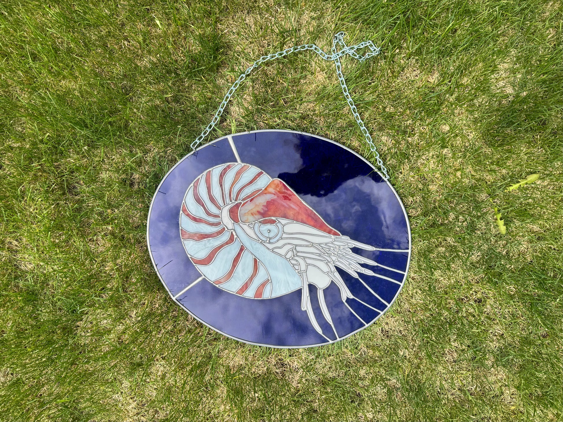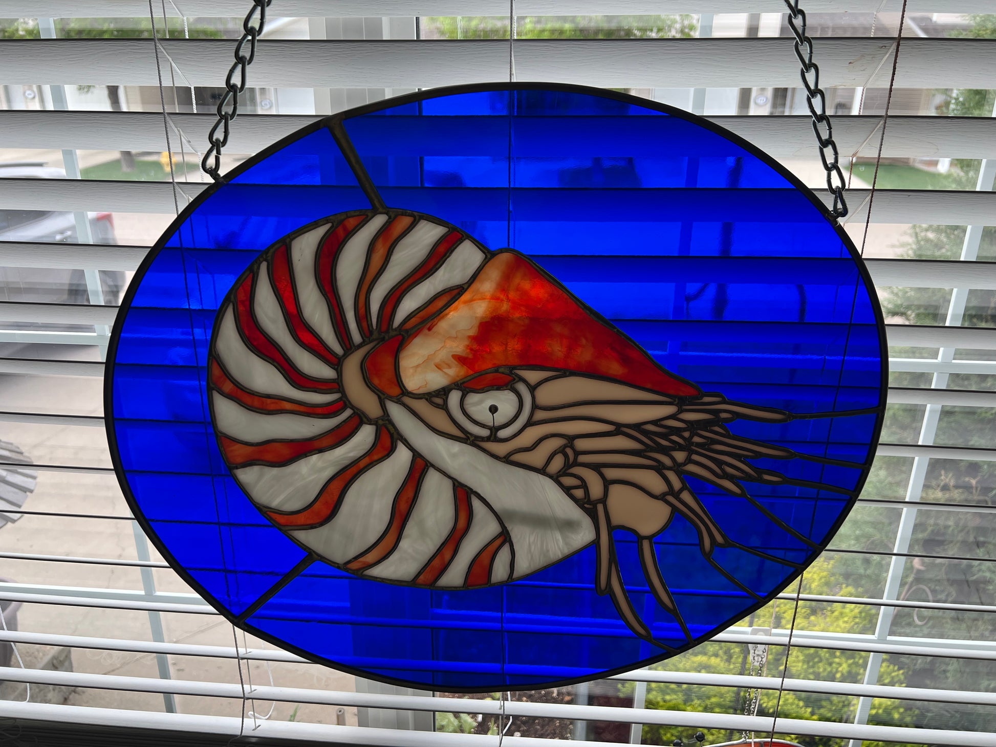 stained glass, copper wire, zinc chain, lead came, solder, copper-restrip reinforcements
