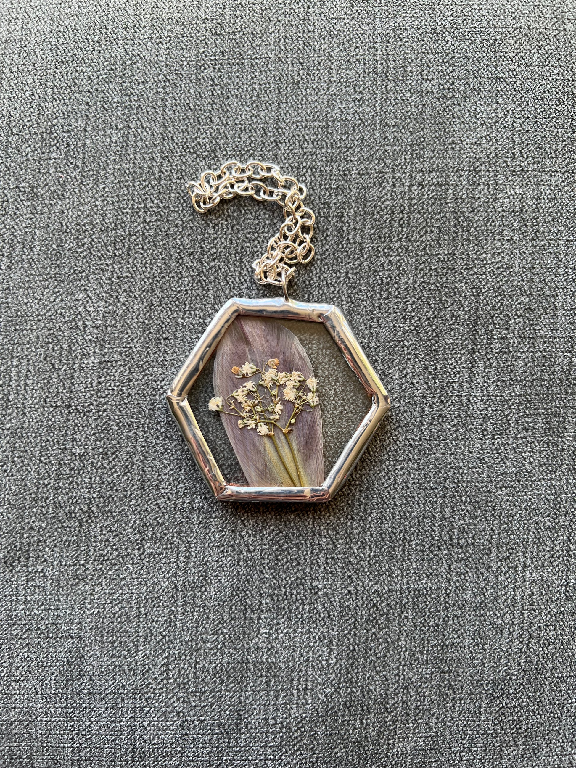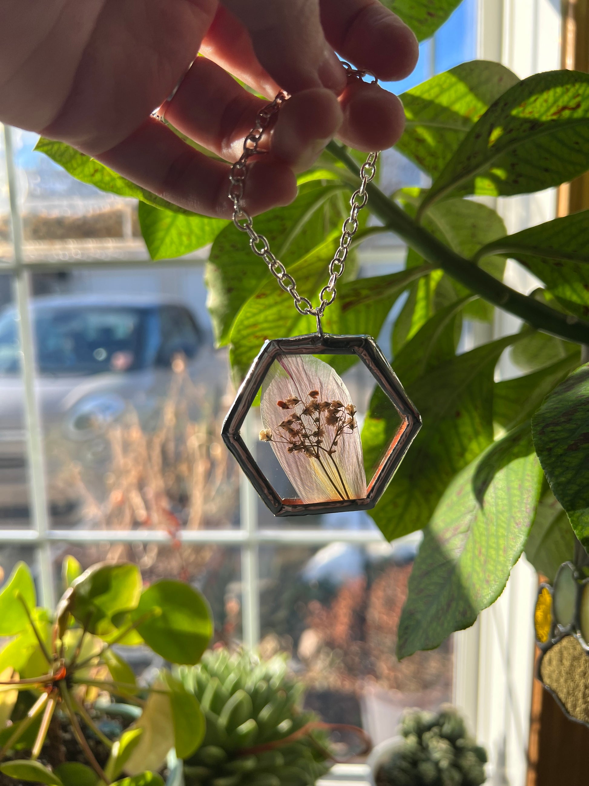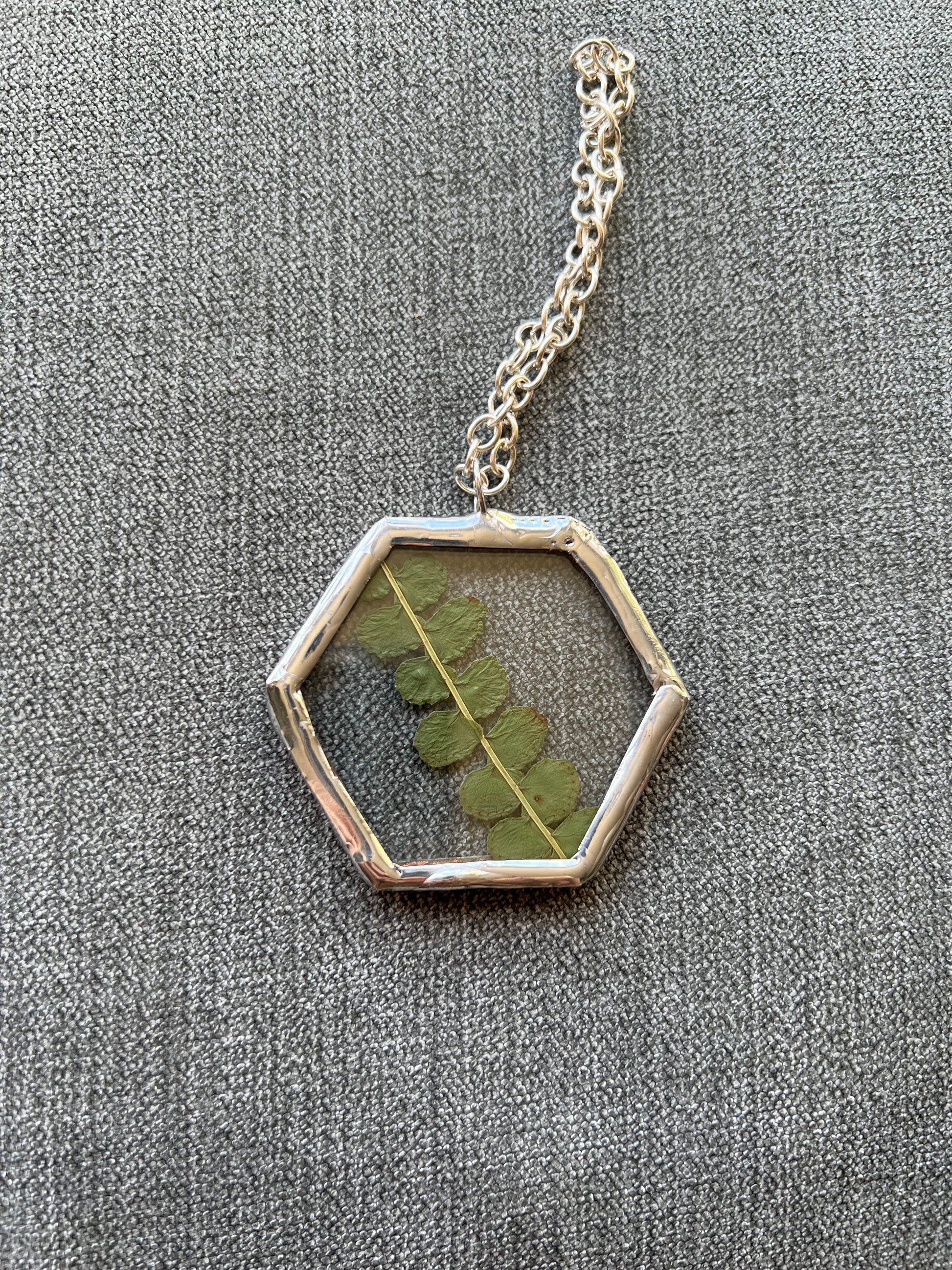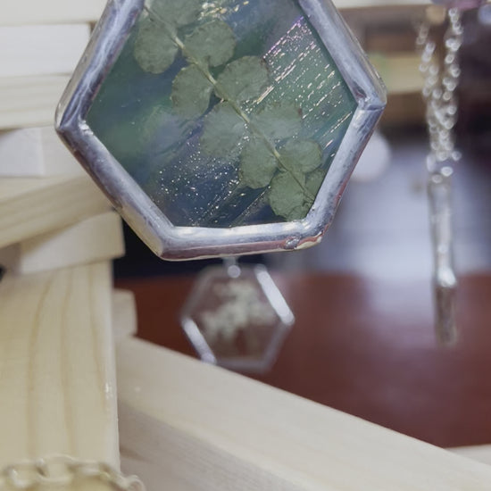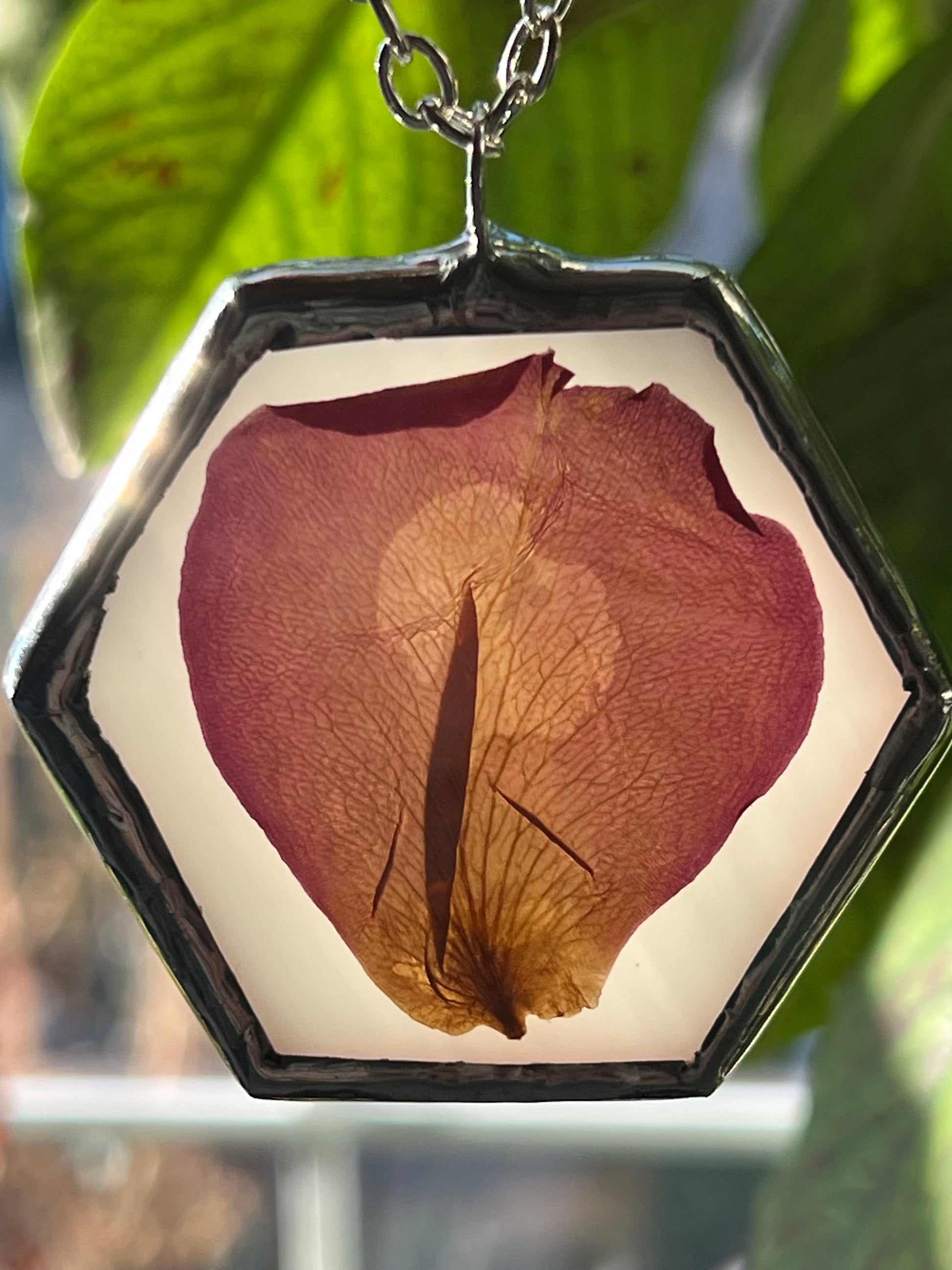 stained glass, copper foil, 60/40 solder, plants, snake shed (no animals harmed when collecting the shed), chain, jump ring.