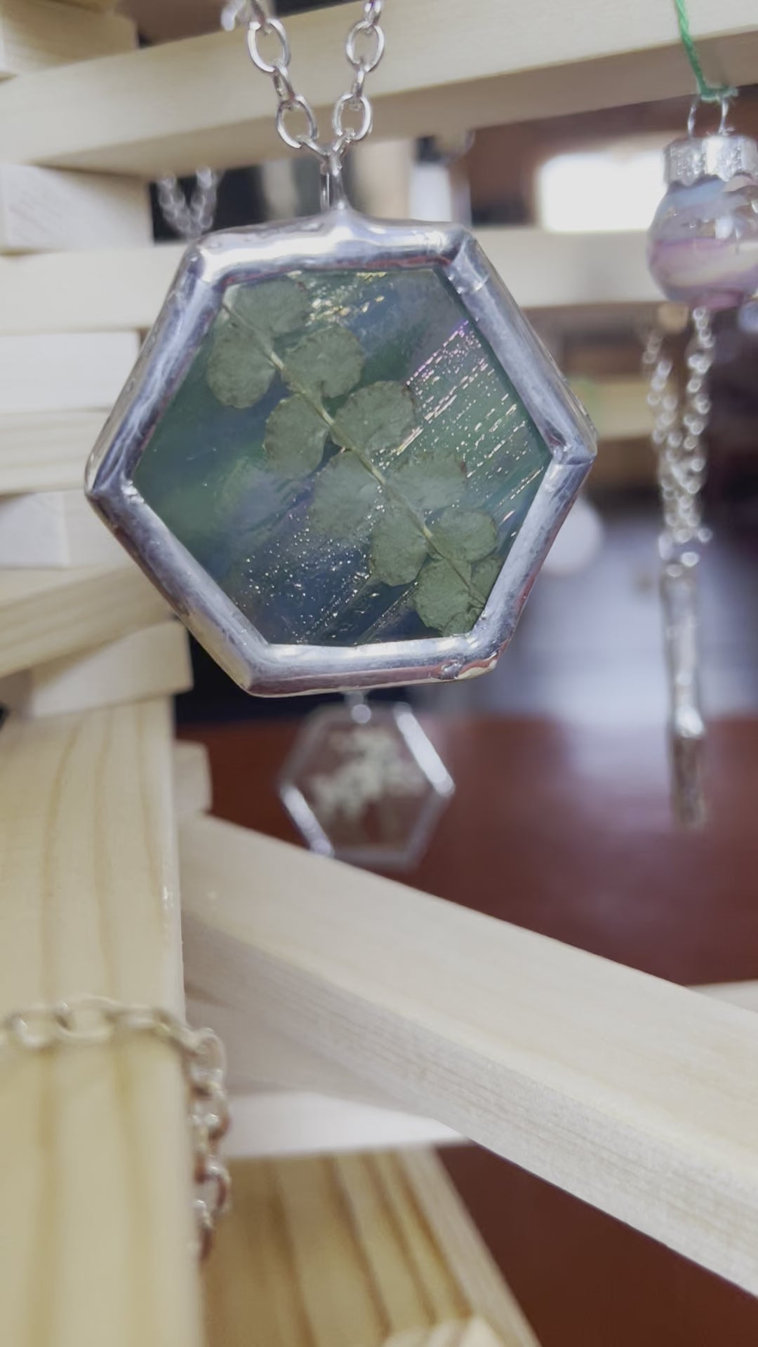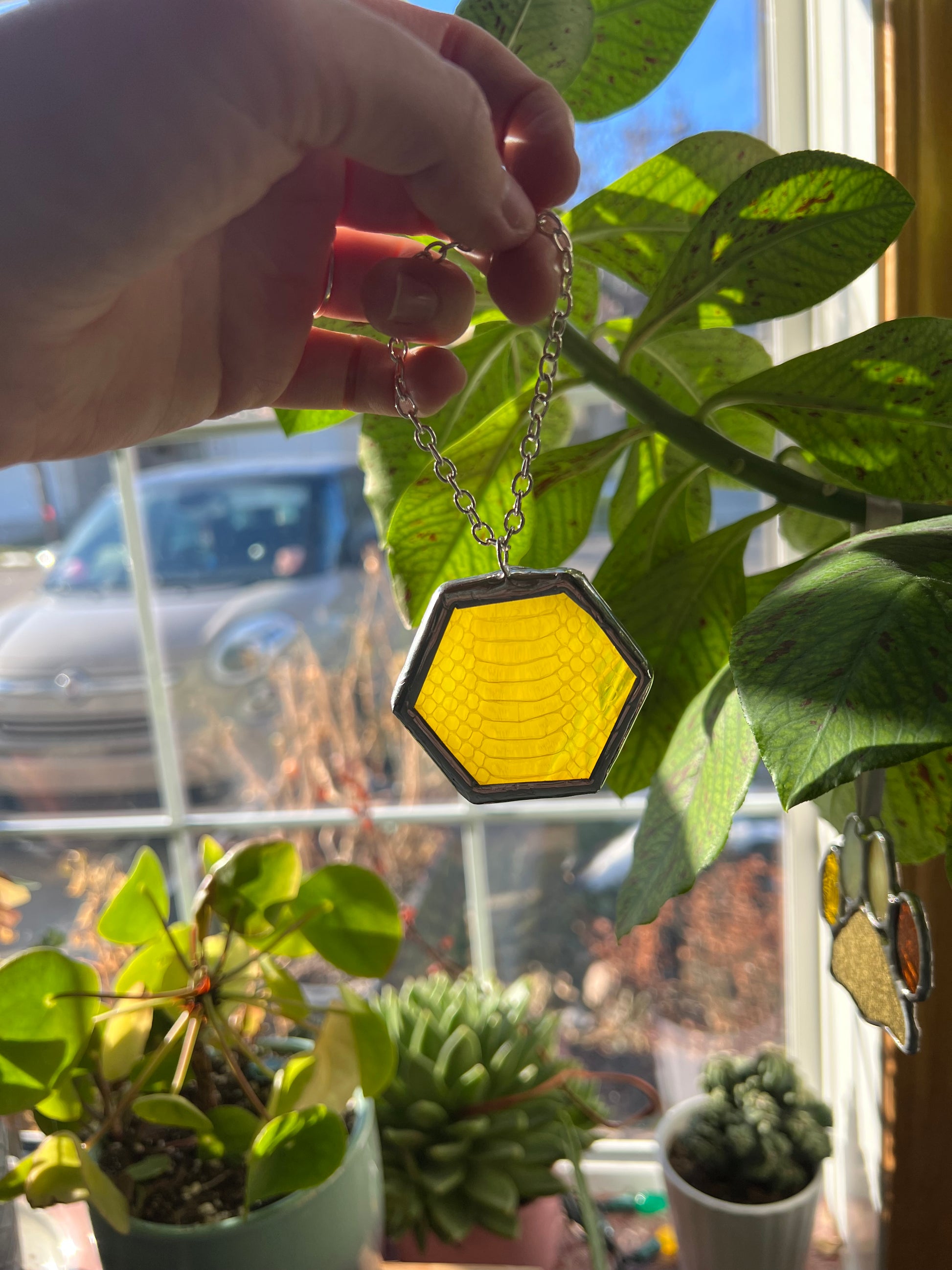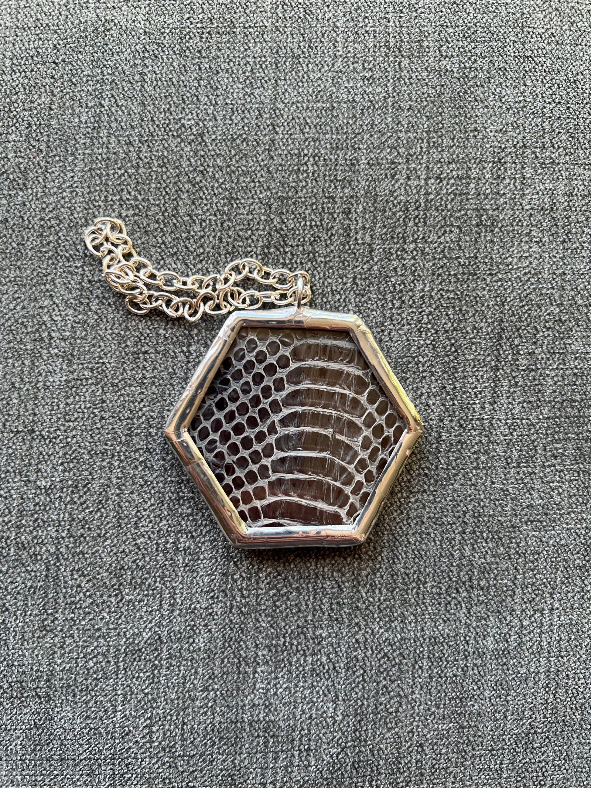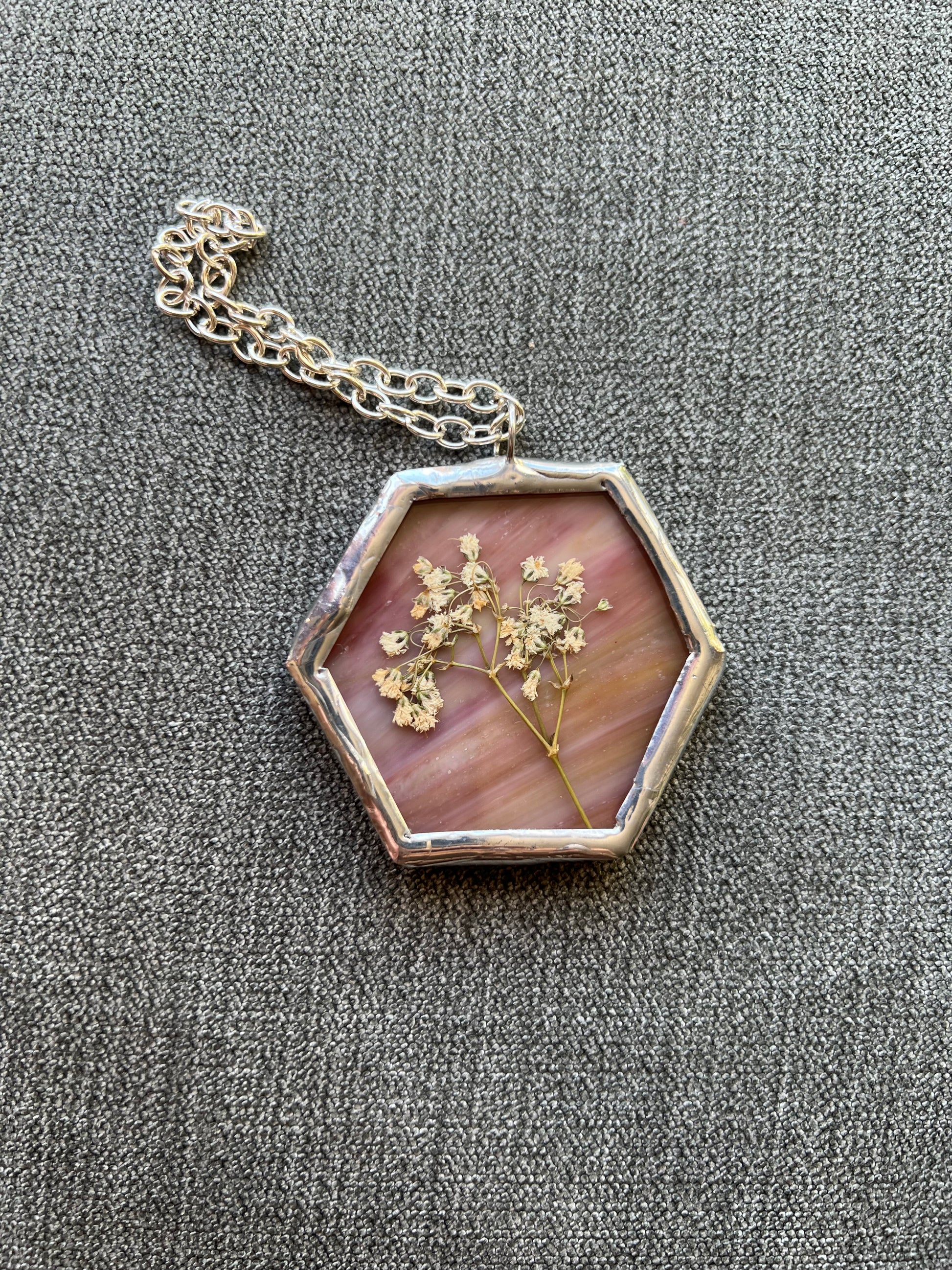 stained glass, copper foil, 60/40 solder, plants, snake shed (no animals harmed when collecting the shed), chain, jump ring.