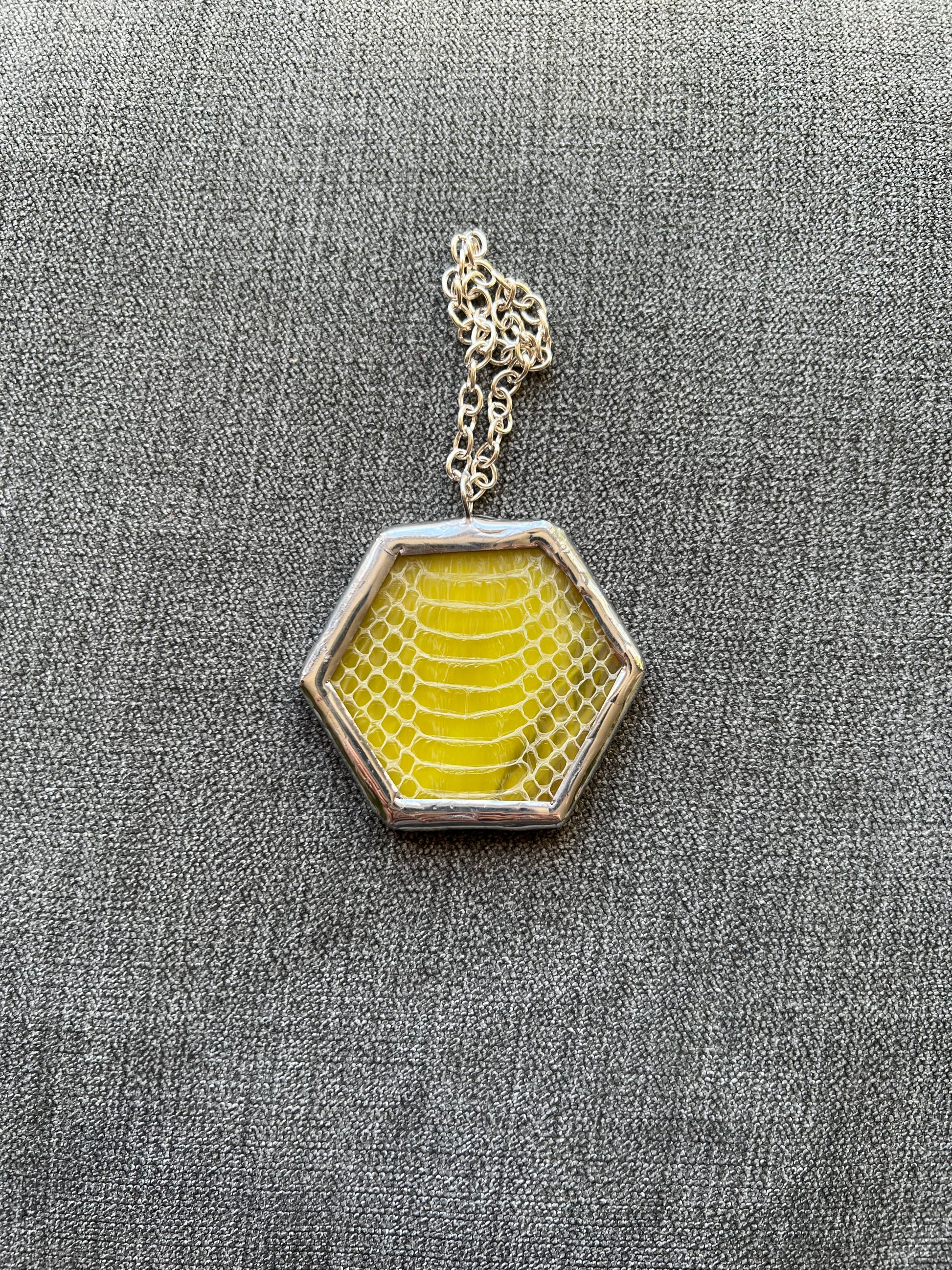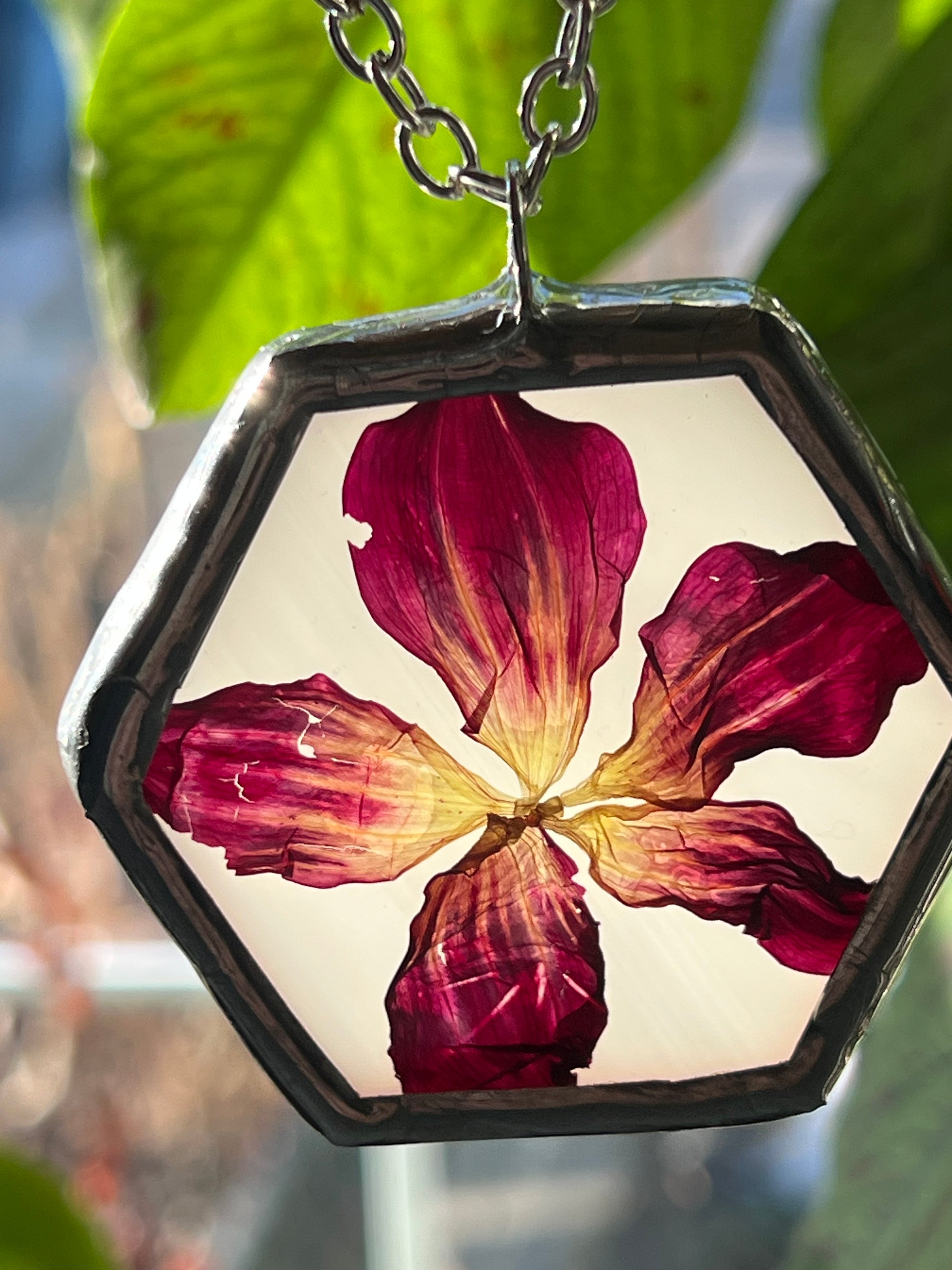 Unique hexagon ornaments with one of a kind flowers and other things pressed between two pieces of glass. The snake shed is safely gathered by my friend, her snake Lt. Dan creates it! The botanicals are all pressed by me.