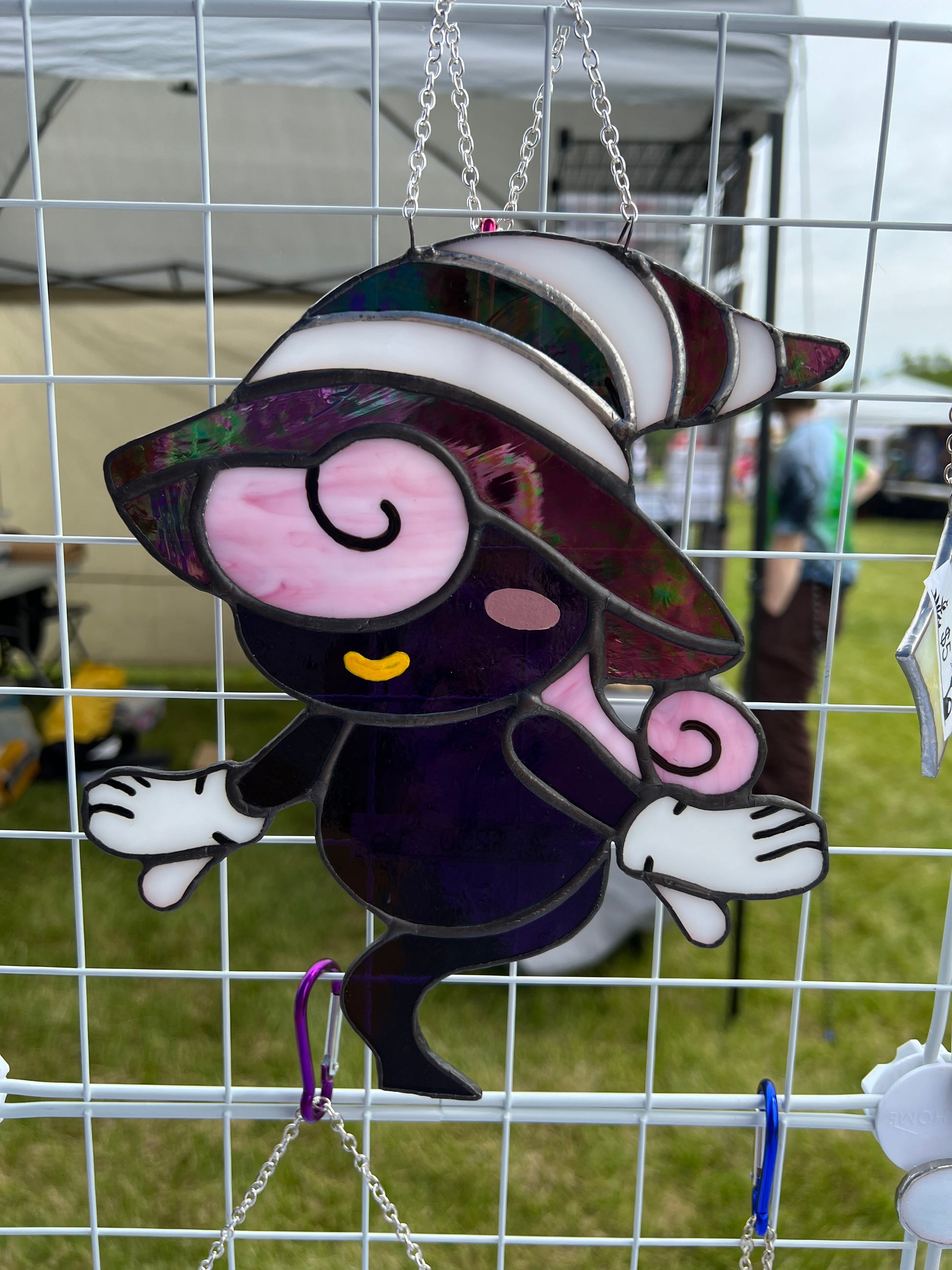 stained glass, black patina, 60/40 solder, pebeo glass paints, chain, copper foil.
